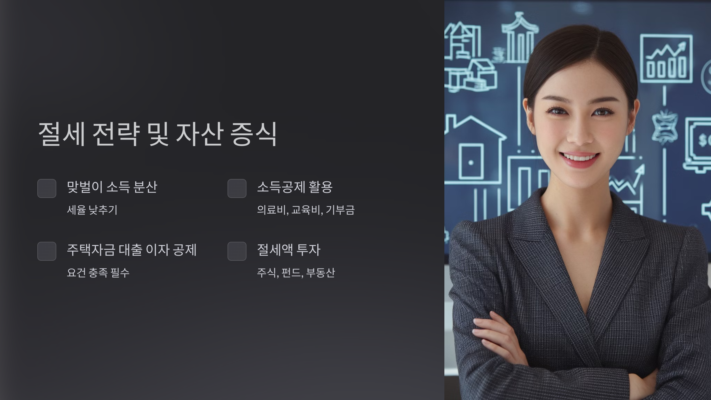 - 주택자금 대출 이자 상환액 공제 활용: 주택 구매 또는 임차 시 대출 이자 상환액 공제를 적극적으로 활용합니다.