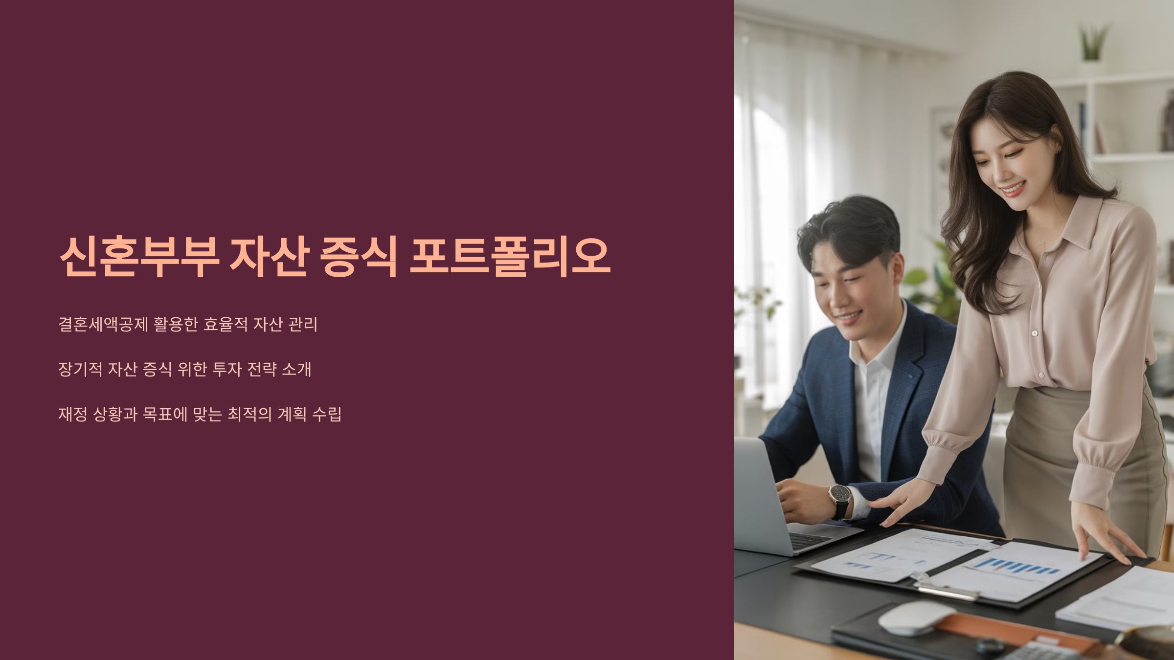 신혼부부 맞춤형 자산 증식 포트폴리오 구성 시 다음과 같은 요소들을 고려해 볼 수 있습니다.