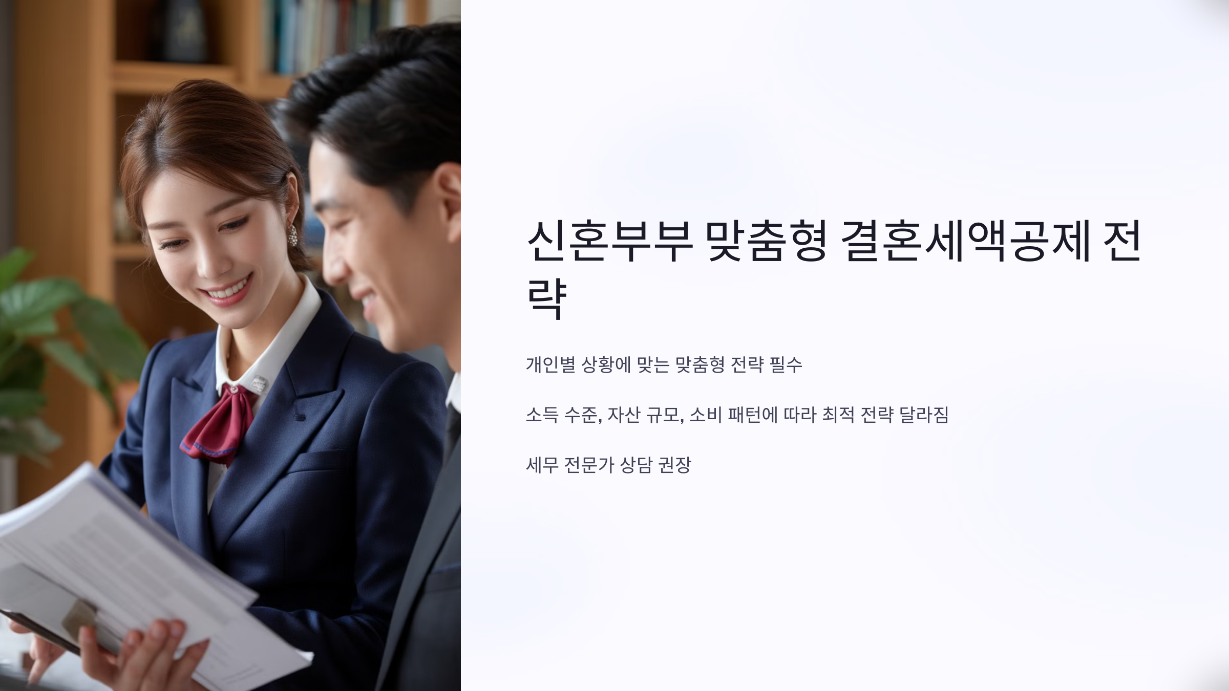 신혼부부가 결혼세액공제를 최대한 활용하기 위해서는 개인별 상황에 맞는 맞춤형 전략이 필수적입니다. 모든 신혼부부가 동일한 세금 혜택을 받는 것이 아니라, 소득 수준, 자산 규모, 소비 패턴 등에 따라 최적의 전략이 달라질 수 있습니다. 예를 들어, 맞벌이 부부와 외벌이 부부의 경우 세금 전략을 다르게 접근해야 합니다.