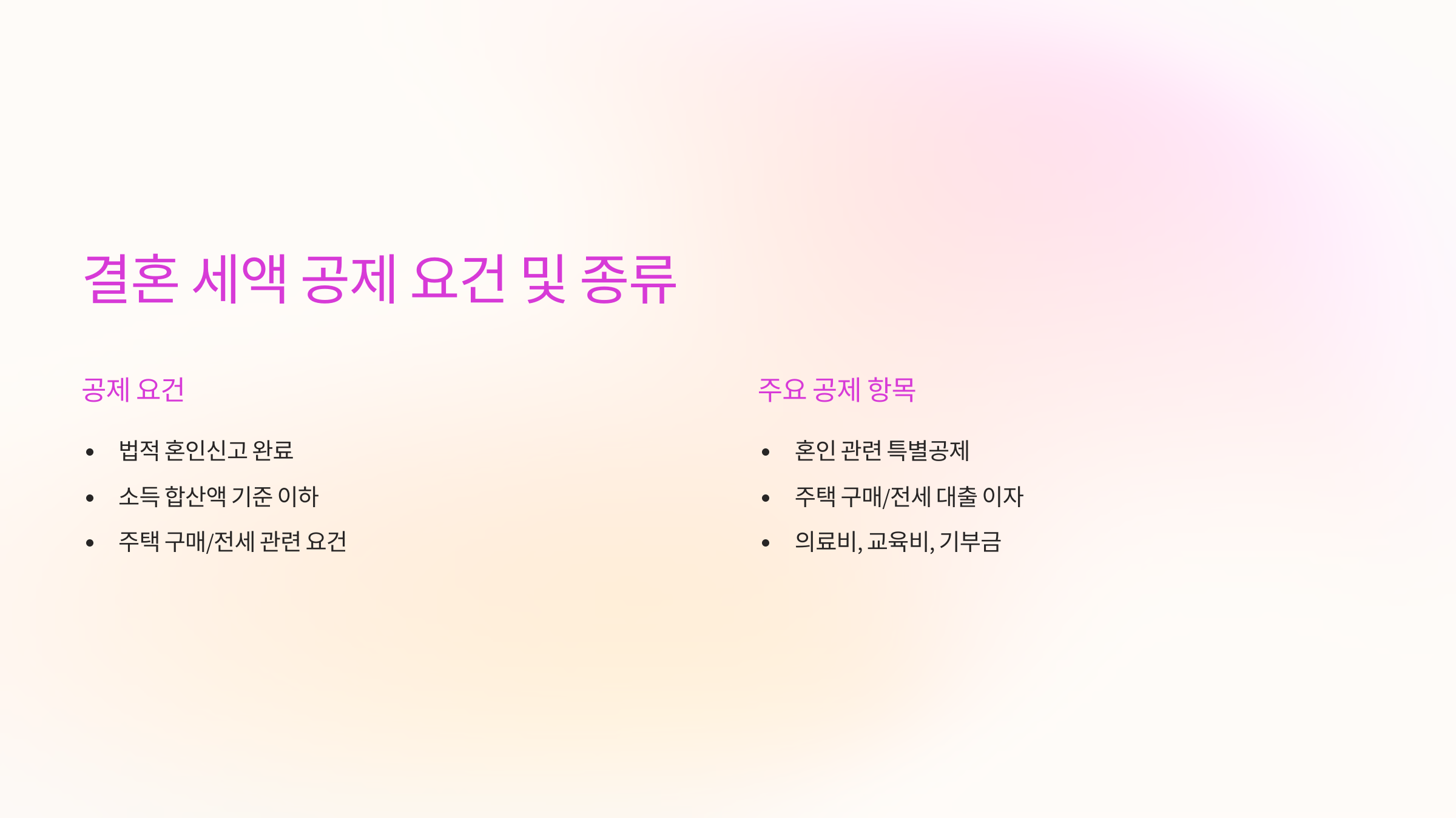 | 신혼부부 주택 구매자금 대출 이자 상환액 공제 | 주택 구매, 대출 조건 충족 | 이자 상환액 일정 비율 공제 (최대 1,800만원) | 매년 연말정산 | 대출 계약서, 등기부등본 |