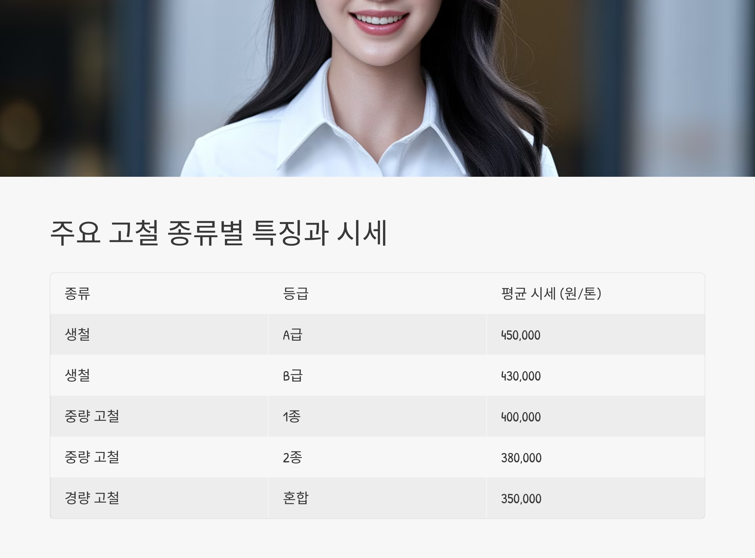 | 고철 종류 | 등급 | 평균 시세 (원/톤) | 특징 | 주요 용도 |