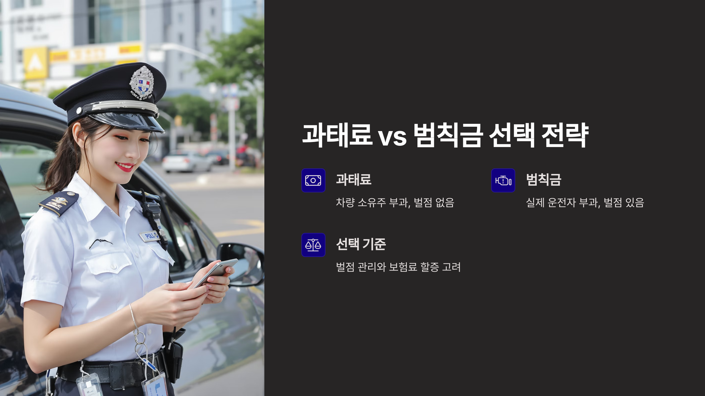| 위반 내용 (승용차 기준) | 과태료 (사전납부 시) | 범칙금 | 벌점 (범칙금 시) | 유리한 선택 가이드 |