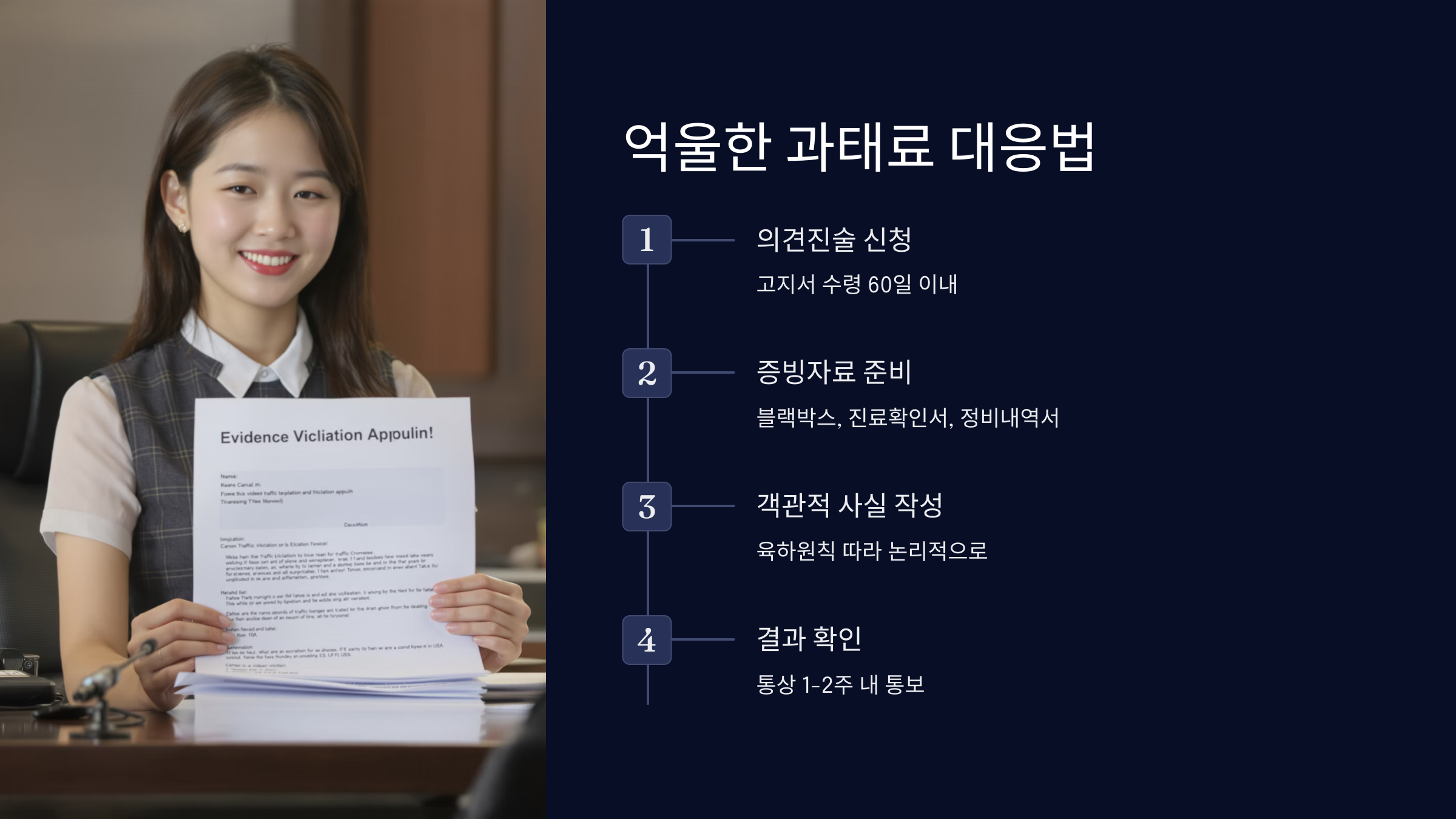 만약 의견진술이 받아들여지지 않아 과태료가 부과된 경우, 이에 불복한다면 고지서를 받은 날로부터 60일 이내에 법원에 이의제기를 하여 정식재판을 청구할 수 있습니다. 하지만 이 단계까지 가기 전에 교통민원 24를 통한 의견진술 단계에서 충실한 자료 준비와 논리적인 주장으로 문제를 해결하는 것이 시간과 비용을 아끼는 현명한 방법입니다.