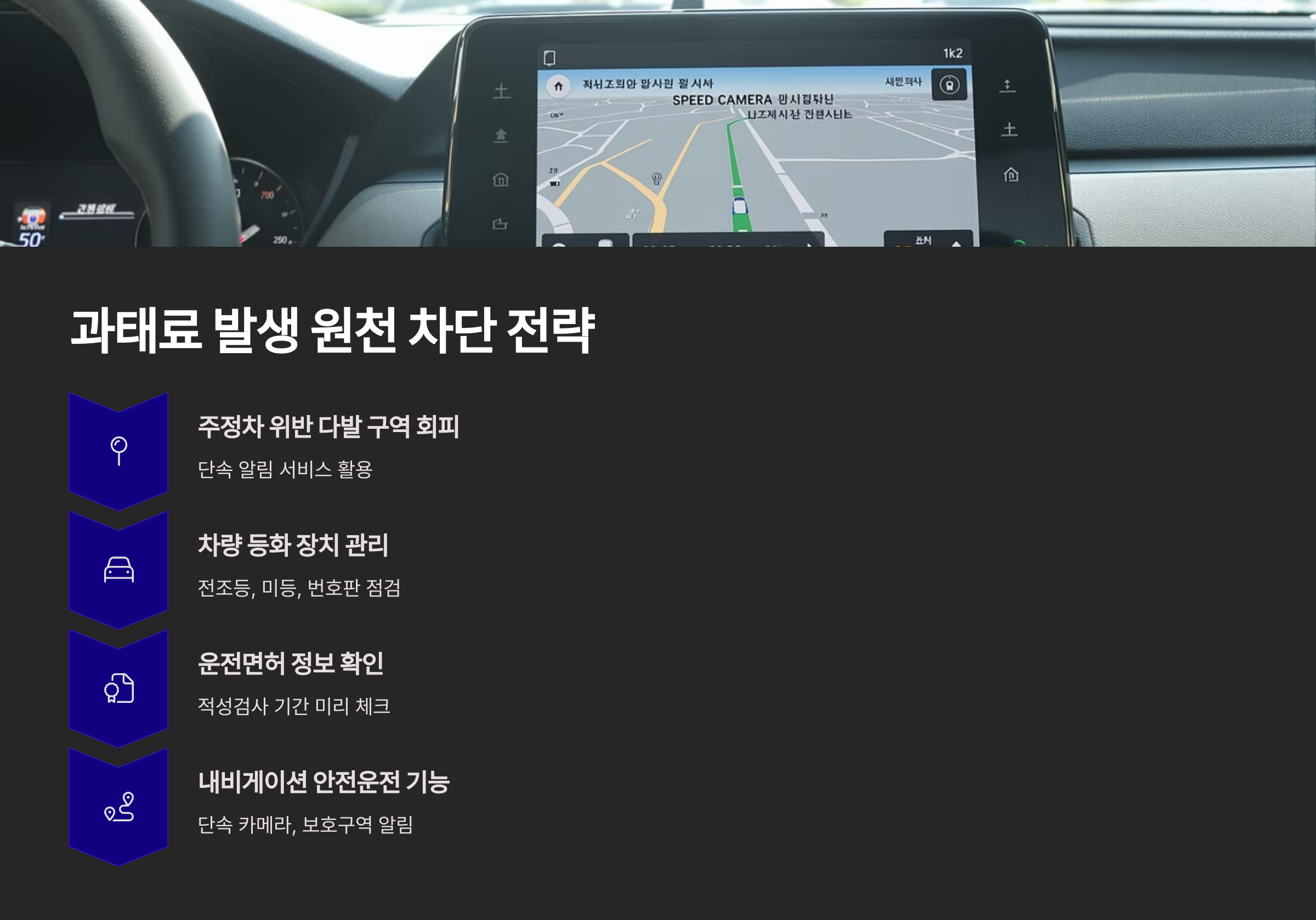 - 내비게이션 안전운전 알림 기능 적극 사용: 최신 내비게이션은 과속단속 카메라, 어린이 보호구역, 사고 다발 구간 등을 미리 알려주어 안전 운전을 유도하고 법규 위반 가능성을 줄여줍니다.