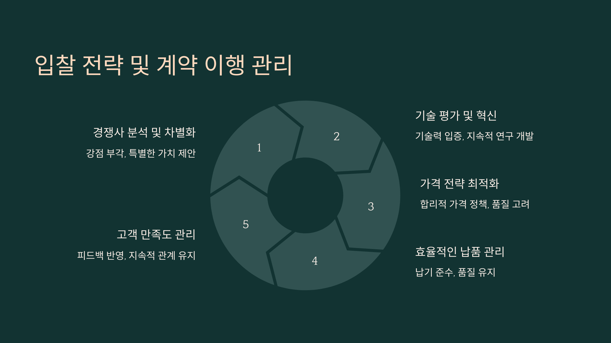 - 기술 평가 및 혁신: 자사의 기술력을 객관적으로 평가하고, 기술 혁신을 통해 경쟁 우위를 확보합니다. 특허, 인증, 수상 경력 등을 활용하여 기술력을 입증합니다. 최신 기술 트렌드를 반영하고, 지속적인 연구 개발을 통해 기술력을 향상 시킵니다.