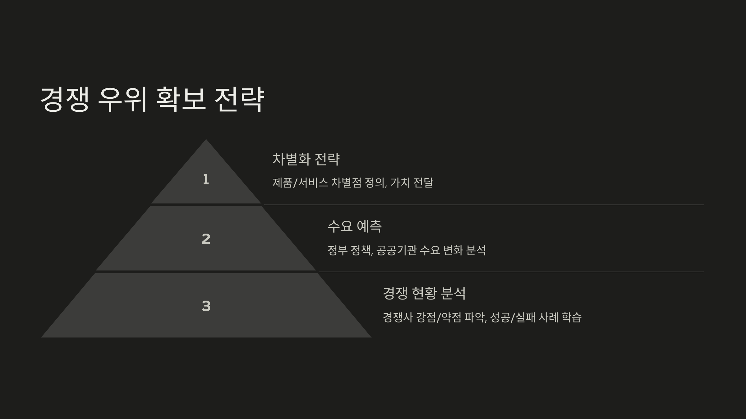 정부 지원 활용 | 자금 확보 | 정부에서 제공하는 다양한 지원 정책을 활용하여 자금 조달, 기술 개발, 그리고 마케팅 활동 등을 지원받습니다. |
