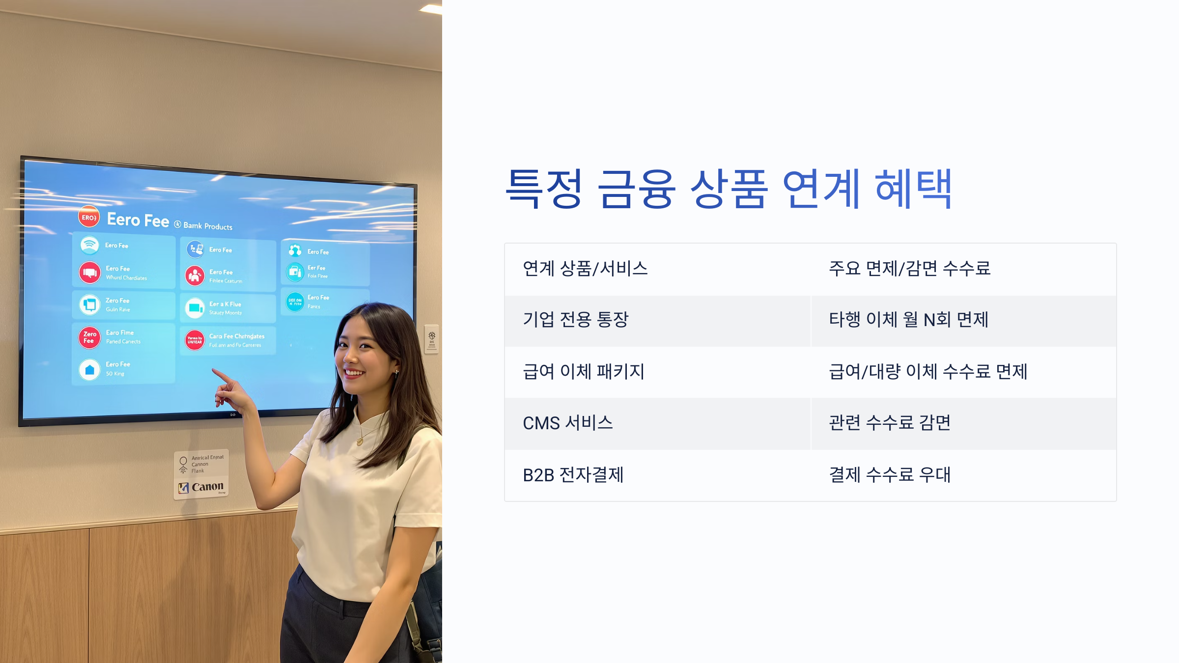 | 기업 전용 통장 | 특정 기업 우대 통장 신규 가입 및 일정 조건 유지 | 타행 이체 수수료 월 N회 면제, SMS 알림 수수료 면제 | 상품 설명서, 약관 확인, 영업점 문의 |