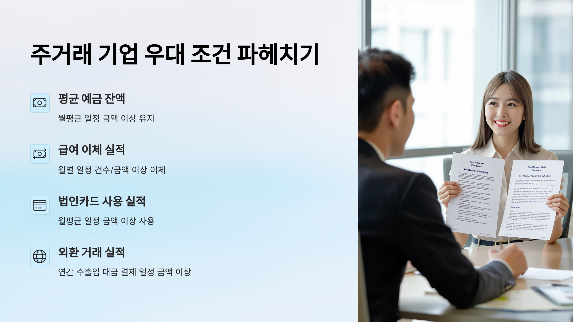 | 외환 거래 규모 | 수출 대금 영수, 수입 신용장 개설, 해외 송금 등 연간 외환 거래 총액 (예: 연 $5만 이상) | 외화 송금 수수료, 전신료, 수출입 관련 수수료 감면 혜택 | 특히 수출입 기업에게 중요한 주거래 요건, 환율 우대 가능성 |