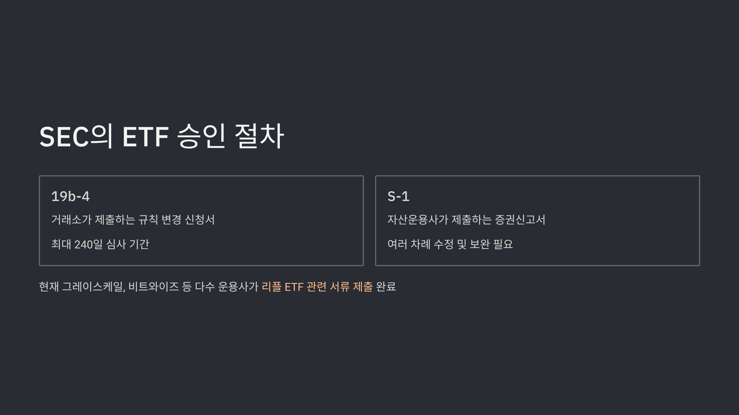 S-1은 자산운용사(예: 그레이스케일, 비트와이즈)가 제출하는 증권신고서로, 투자자에게 상품의 구조, 위험성, 운용 방식 등 상세 정보를 제공하는 문서입니다. SEC는 이 두 서류를 모두 검토하며, 특히 S-1 서류에 대해 여러 차례 수정 및 보완을 요구하는 것이 일반적입니다. 비트코인 현물 ETF의 경우에도 여러 자산운용사들이 S-1 서류를 수차례 수정한 끝에 최종 승인을 받을 수 있었습니다. 현재 그레이스케일, 비트와이즈 등 다수의 운용사가 리플 ETF 관련 19b-4 서류를 제출했으며, SEC가 이를 공식 인정하고 심사 절차에 돌입했습니다.