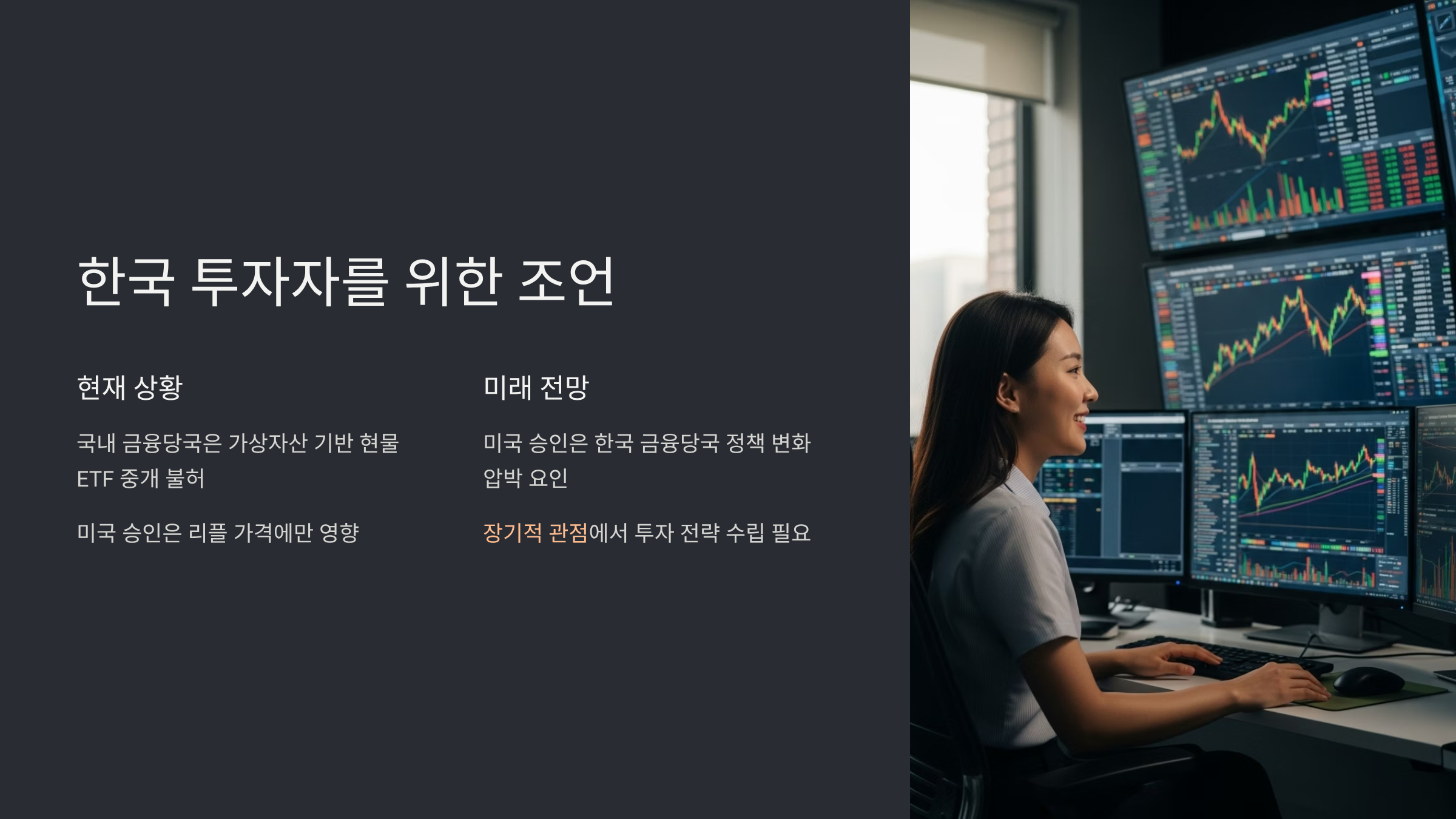 다만, 미국의 승인은 우리나라 금융당국의 정책 변화를 압박하는 강력한 요인이 될 수 있습니다. 비트코인, 이더리움에 이어 리플까지 주요 가상자산의 현물 ETF가 글로벌 표준으로 자리 잡게 되면, 우리나라도 더 이상 이를 외면하기는 어려울 것입니다. 투자자들은 미국 SEC의 동향과 함께 우리나라 금융위원회의 정책 방향을 함께 주시하며 장기적인 관점에서 투자 전략을 수립하는 것이 현명합니다.