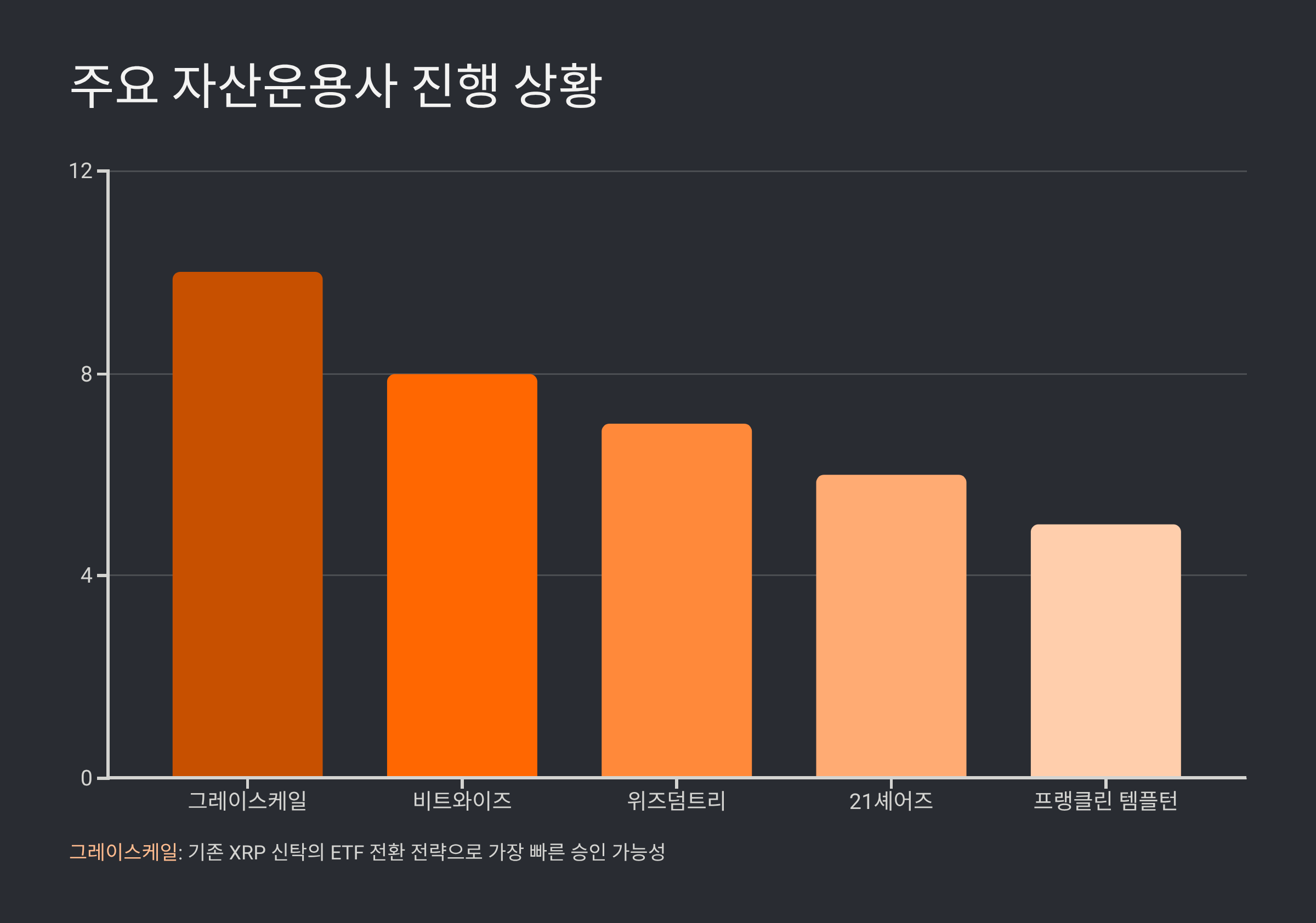 현재 여러 자산운용사가 리플 ETF 시장 선점을 위해 경쟁하고 있습니다. 각 운용사의 진행 상황과 전략을 비교 분석하는 것은 전체적인 승인 가능성을 가늠하는 데 도움이 됩니다. 그레이스케일은 기존의 XRP 신탁을 ETF로 전환하려 하고 있으며, 이는 가장 빠른 길이 될 수 있습니다. 비트와이즈, 위즈덤트리 등 다른 운용사들도 각각의 강점을 내세워 SEC를 설득하고 있습니다.