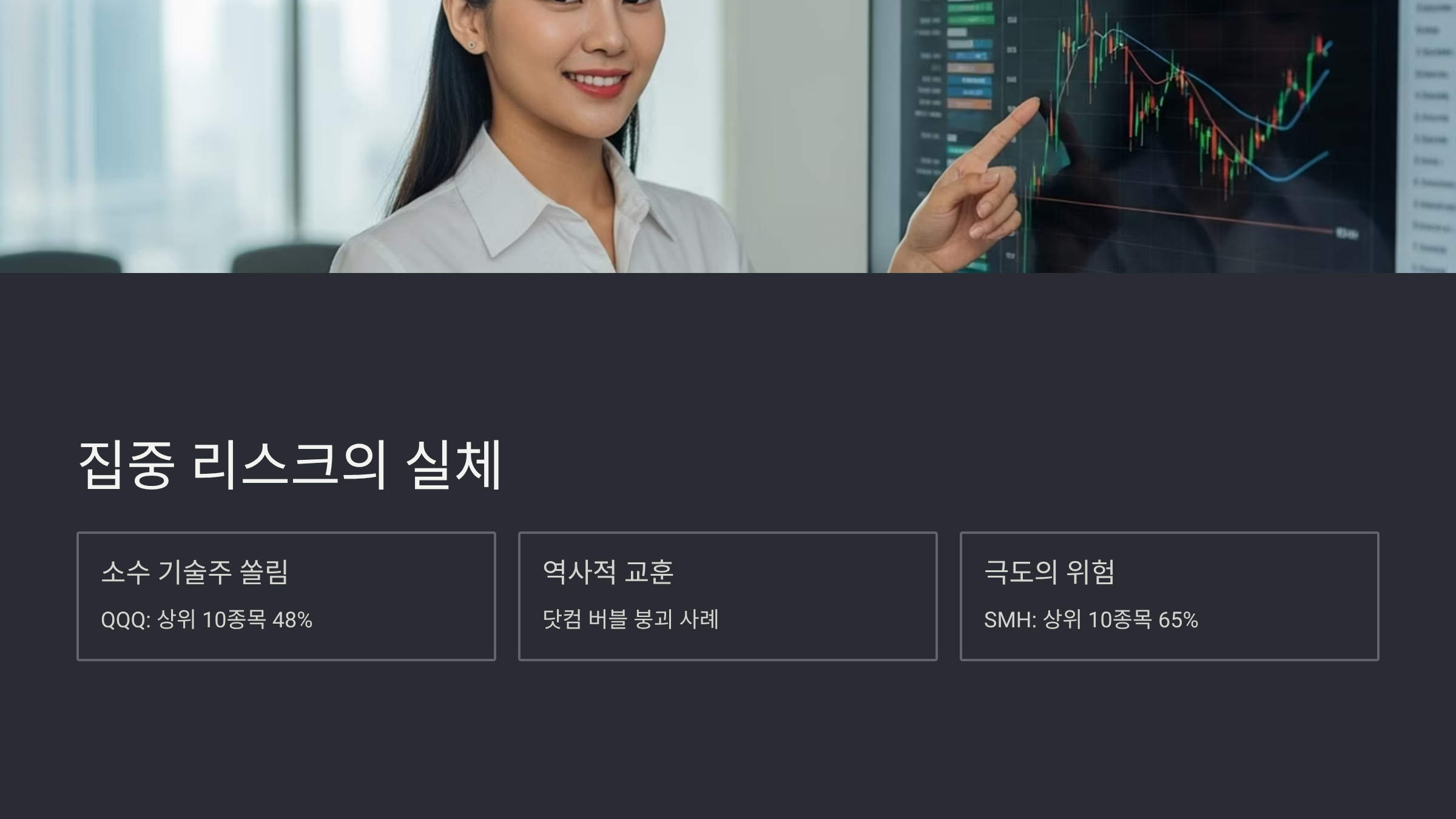 | SMH | 미국 상장 반도체 25 | 약 65% | 극도로 높음 | 엔비디아, TSMC 등 소수 종목 비중이 절대적이어서 특정 기업 리스크에 크게 노출됨 |