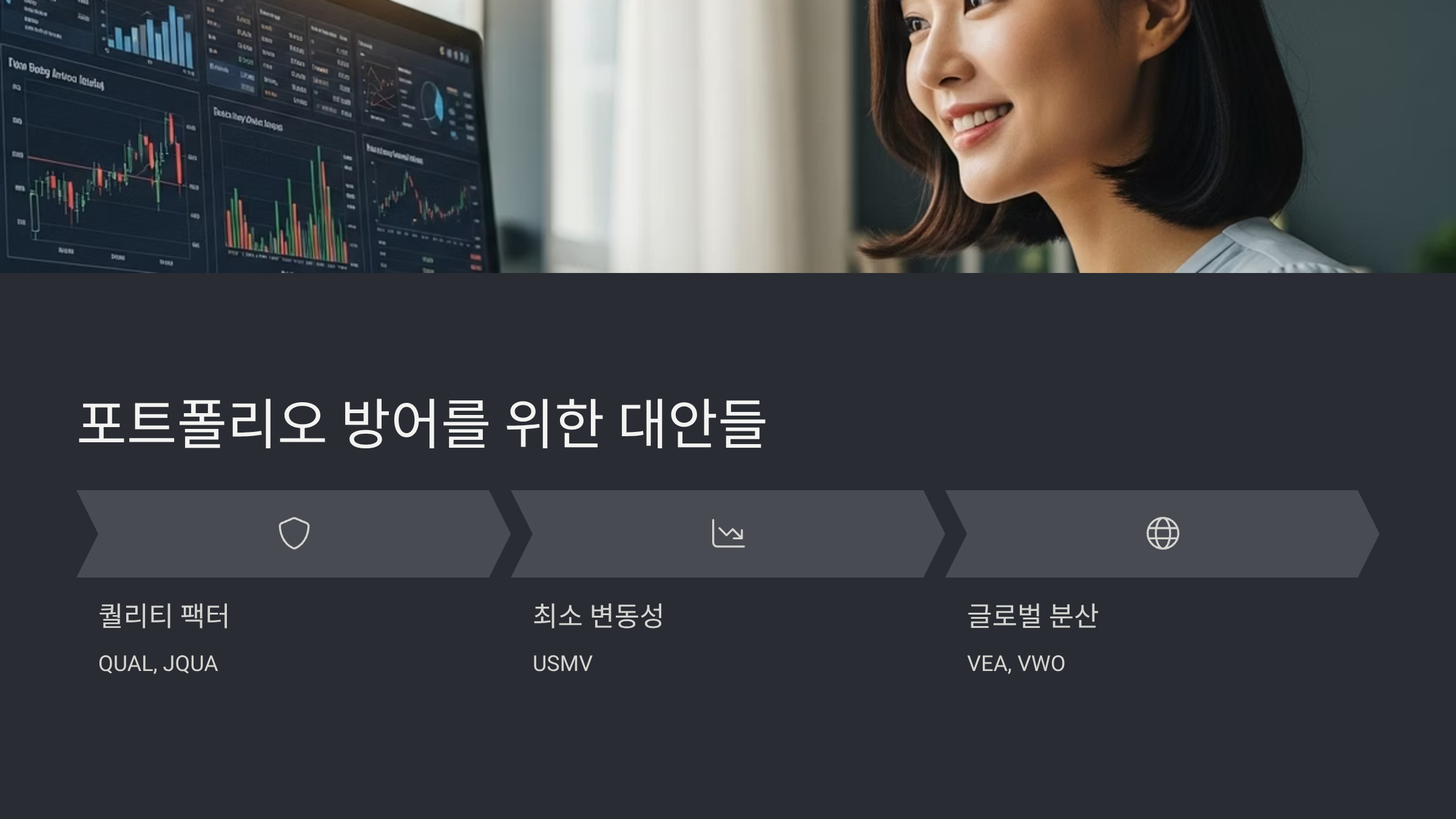 - 미국 외 선진국 ETF (VEA) / 신흥국 ETF (VWO): 미국 증시가 조정을 받을 때, 다른 흐름을 보이는 비미국 자산은 훌륭한 위험 분산 도구가 됩니다. 포트폴리오에 달러 외 통화 자산을 편입하는 효과도 있습니다.