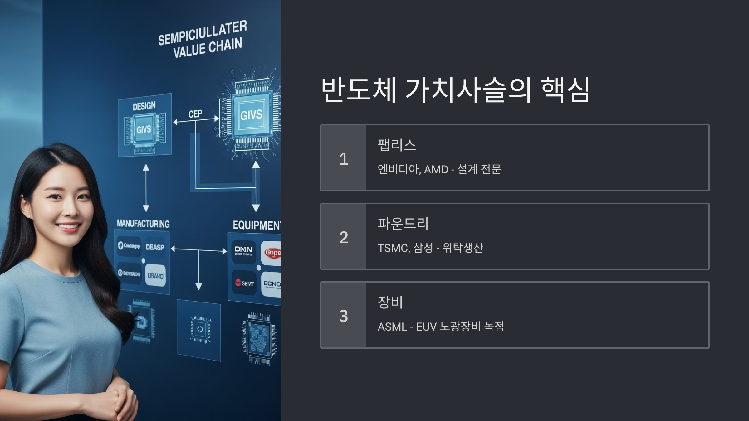 성공적인 반도체 ETF 투자를 위해서는 이 산업이 어떻게 구성되어 있는지, 즉 '가치사슬(Value Chain)'을 이해하는 것이 필수적입니다. 단순히 엔비디아라는 단일 기업을 넘어 전체 생태계에 투자하는 것이 바로 반도체 ETF의 핵심 전략입니다.