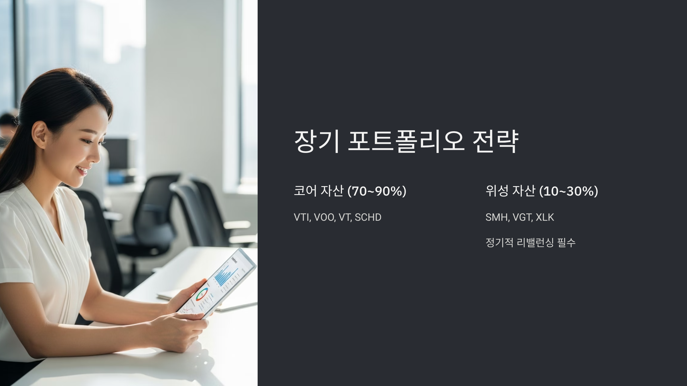 이 전략의 핵심은 포트폴리오의 안정성을 해치지 않는 범위 내에서 초과 수익을 추구하는 것입니다. 여기서 위성 자산은 레버리지 ETF가 아닌, 특정 테마에 집중하는 비-레버리지 상품(예: SMH, VGT)이 적합합니다.
