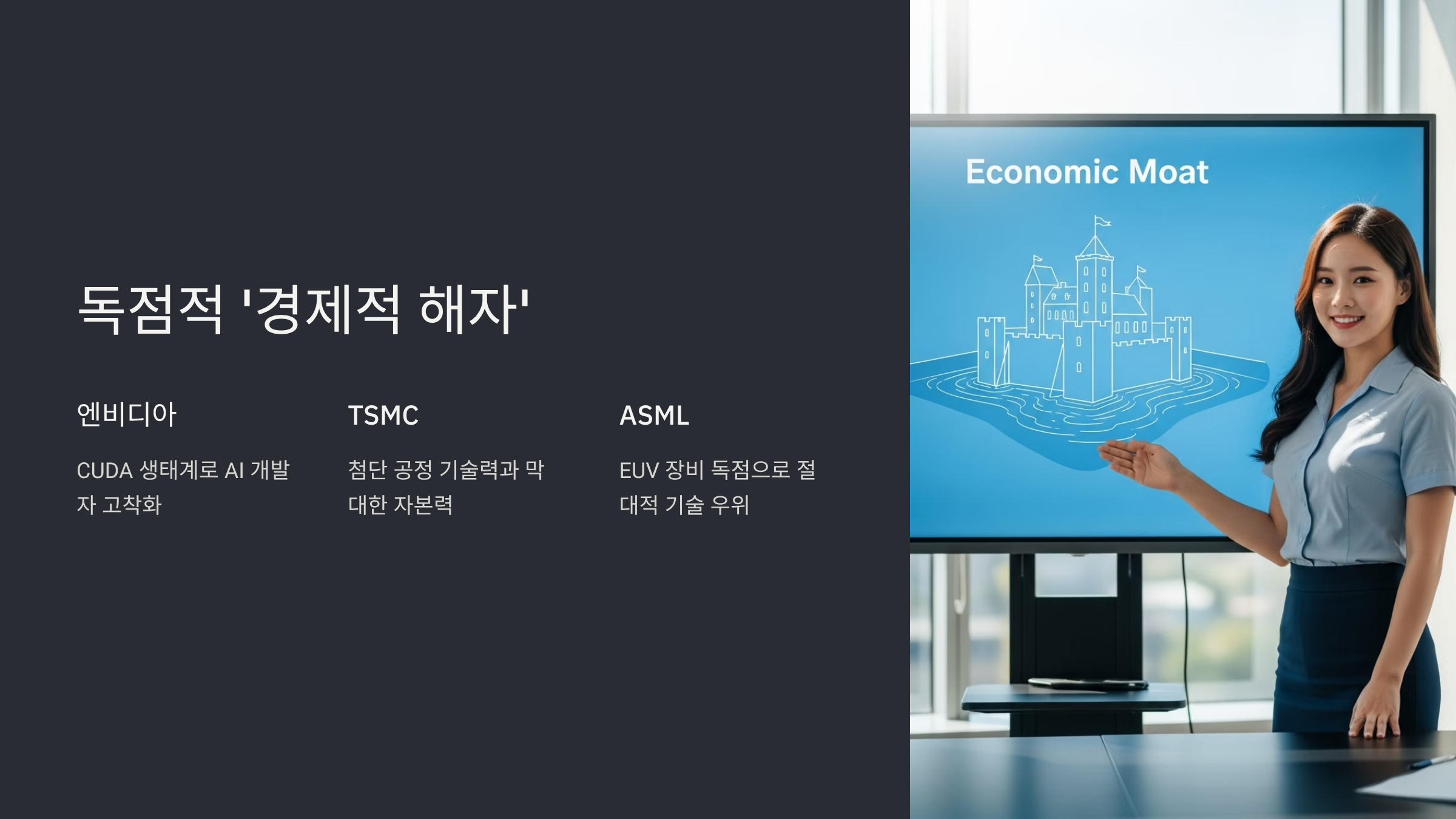미국 etf 수익률 순위 상위권의 비밀은 바로 핵심 기업들이 구축한 '경제적 해자(Economic Moat)'에 있습니다. 경제적 해자란 다른 경쟁사들이 쉽게 넘볼 수 없는 강력한 경쟁 우위를 의미하며, 이는 장기적으로 안정적인 수익을 창출하는 원동력이 됩니다. 반도체 산업의 핵심 플레이어들은 각자 강력한 해자를 보유하고 있습니다.