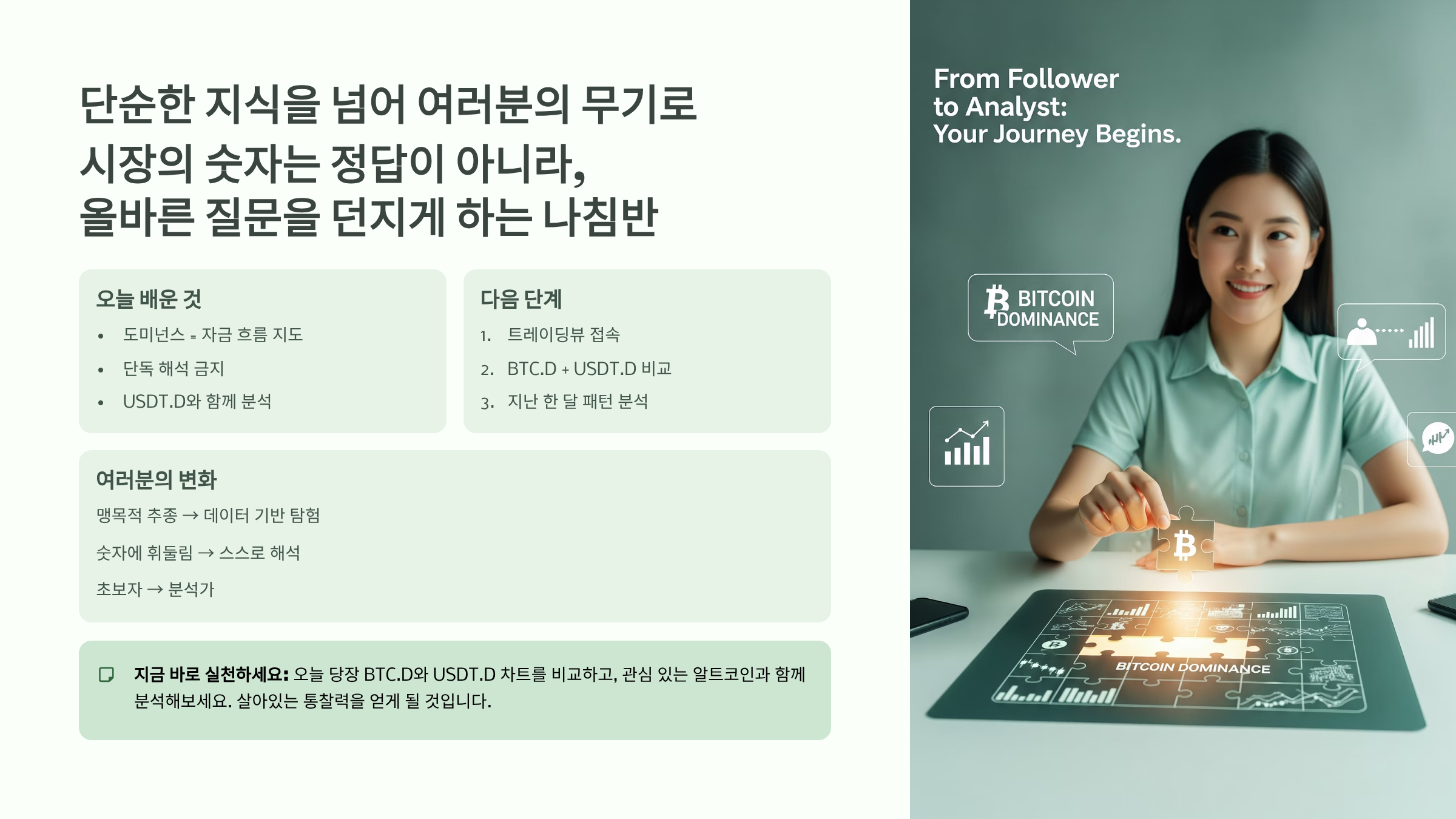 여러분은 오늘 단순한 지표 하나를 배운 것이 아닙니다. 시장의 데이터를 해석하고, 비판적으로 사고하며, 자신만의 투자 원칙을 세워나가는 '분석가'로서의 첫걸음을 뗀 것입니다. 비트코인 도미넌스라는 나침반을 손에 쥔 여러분의 투자 여정은 이제 더 이상 맹목적인 추종이 아닌, 데이터에 기반한 탐험이 될 것입니다. 이 디지털 신대륙에서 자신만의 길을 개척하고 경제적 주권을 찾아 나가는 길에 오늘 배운 내용이 든든한 무기가 되어줄 것입니다.