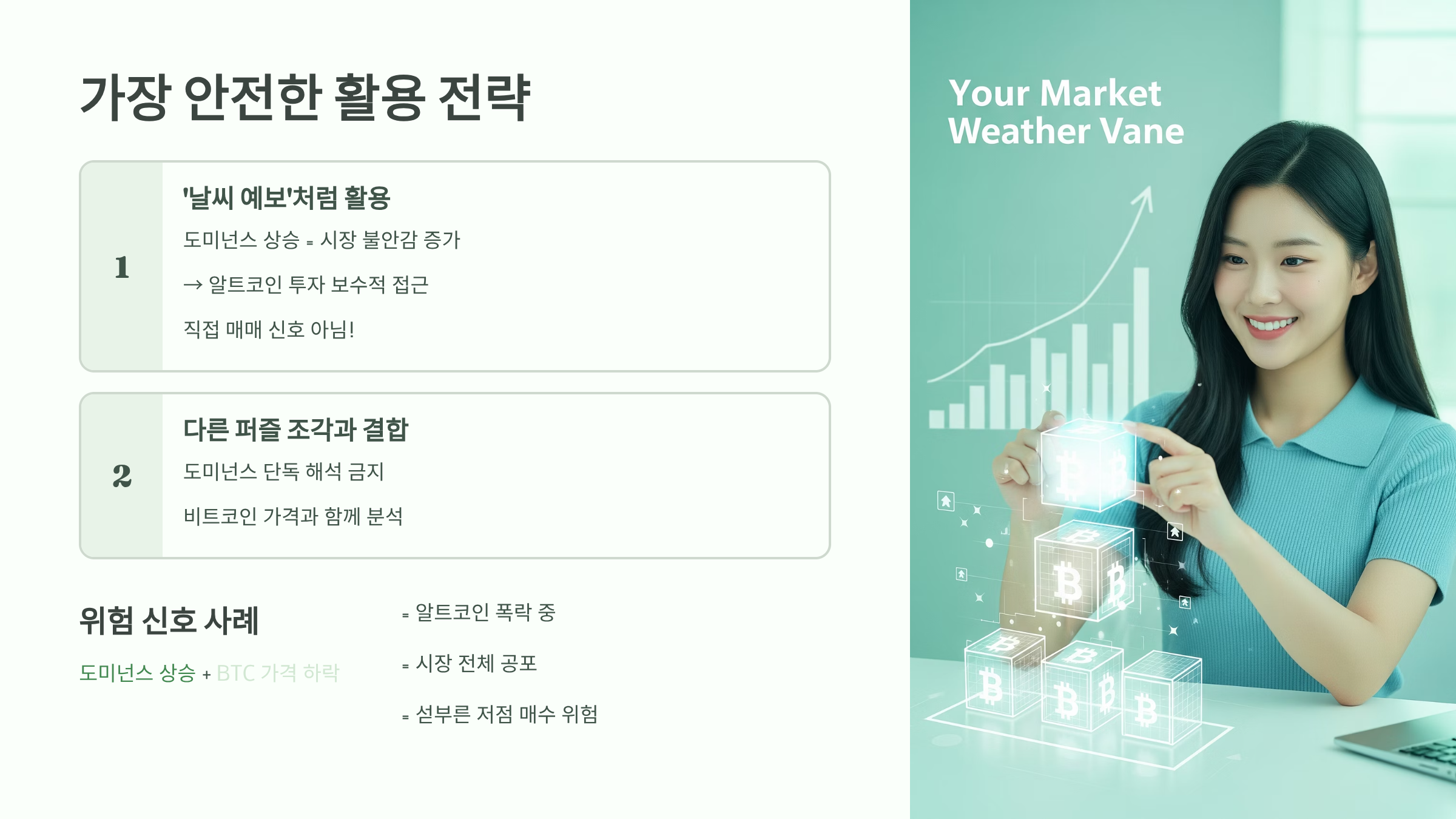- 사례: 만약 '도미넌스는 오르는데, 비트코인 가격은 하락'한다면 무슨 의미일까요? 이는 비트코인보다 알트코인이 훨씬 더 큰 폭으로 무너지고 있다는 뜻입니다. 시장 전체가 공포에 질려있다는 강력한 신호이며, 섣불리 저점 매수에 나섰다가는 큰 손실을 볼 수 있는 위험한 구간입니다. 이처럼 다른 데이터와 결합할 때 비로소 진짜 의미가 드러납니다.