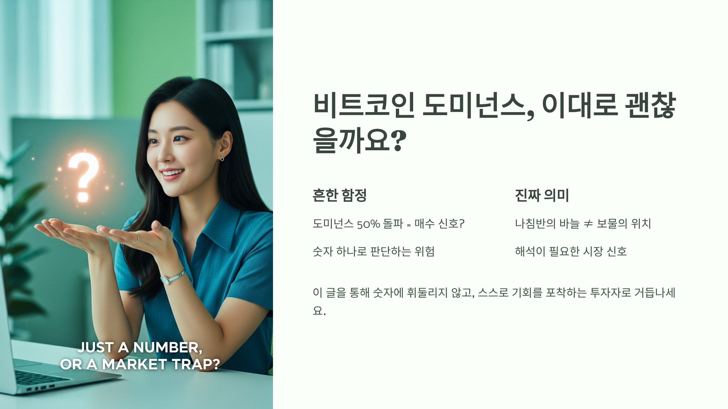 글의 시작에서 던졌던 질문을 다시 떠올려 보겠습니다. "비트코인 도미넌스 50% 돌파, 무작정 매수해도 될까?" 이제 여러분은 이 질문에 "아니오"라고 자신 있게 답할 수 있을 뿐만 아니라, "왜 아닌지" 그리고 "무엇을 더 확인해야 하는지" 스스로 설명할 수 있게 되었습니다.