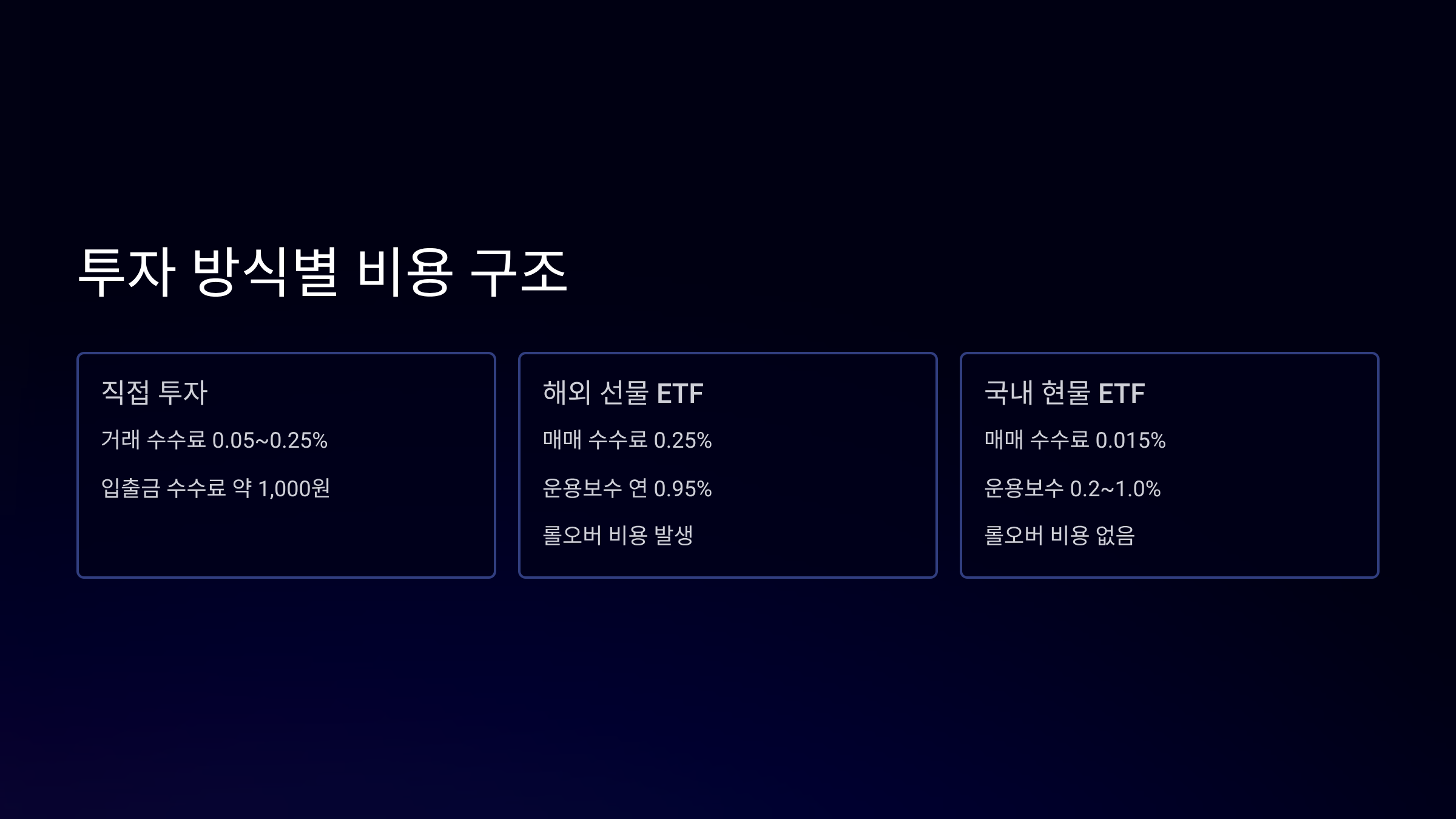 | 항목 | 직접 투자 | 해외 선물 ETF | 국내 현물 ETF (가정) |