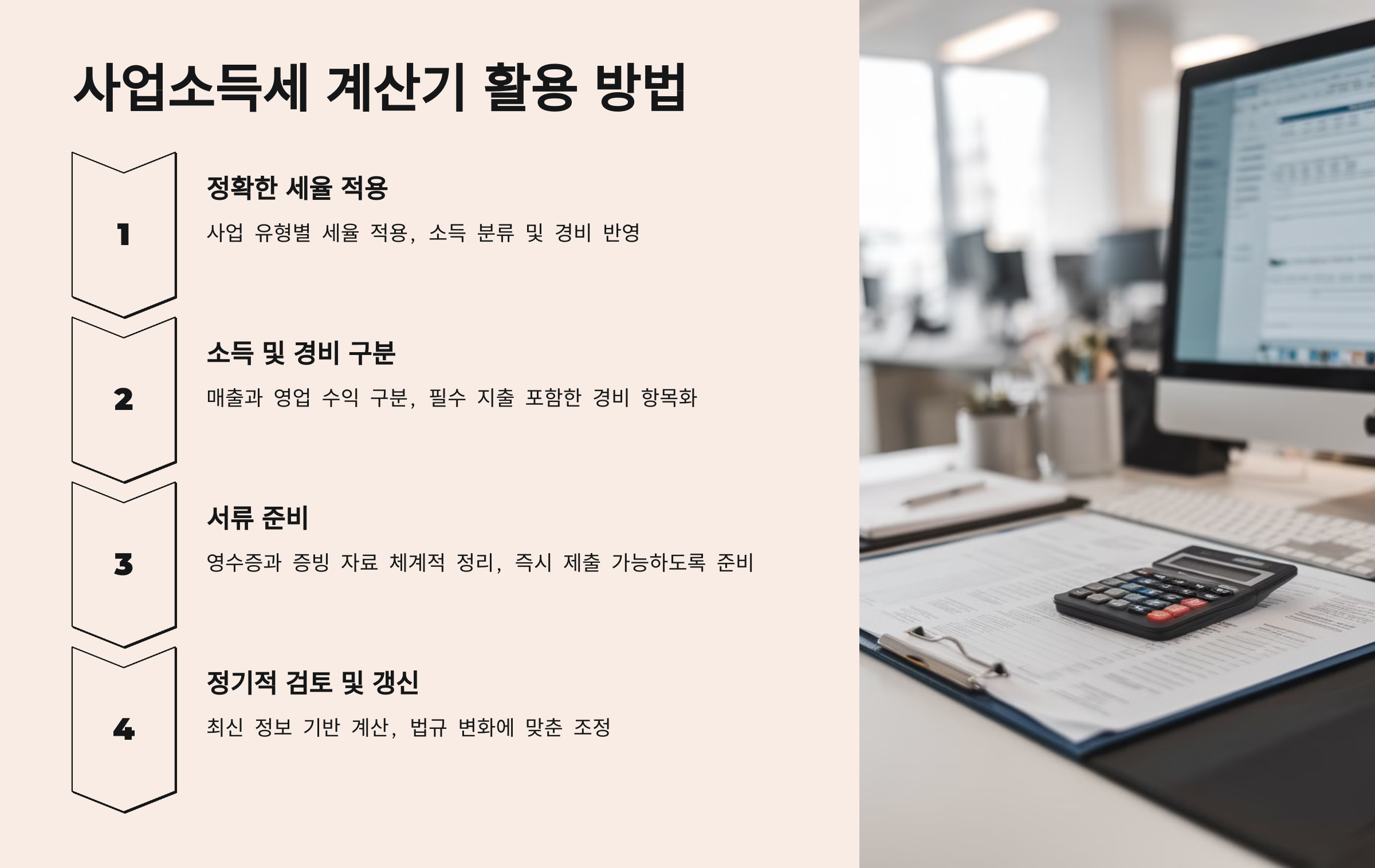 사업소득세 계산기 사용 시 가장 중요한 것은 정확한 소득 구분과 세율 적용입니다. 다음과 같은 순서로 진행하시면 됩니다:
