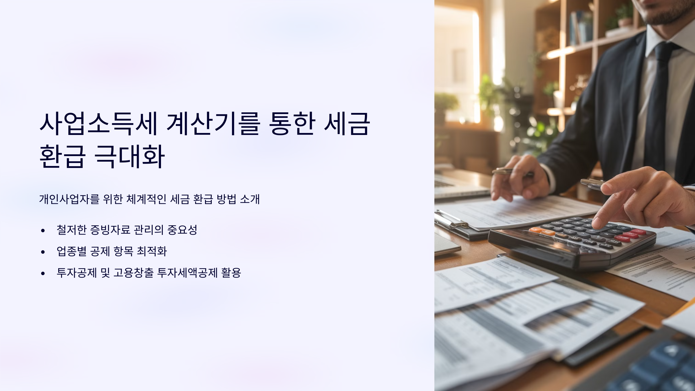 사업소득세 계산기를 통한 세금 환급 극대화 방법에 대해 알아보겠습니다. 사업소득세 계산기를 효과적으로 활용하면 합법적인 방법으로 세금 환급을 최대화할 수 있습니다. 이 글을 통해 개인사업자들이 놓치기 쉬운 세금 환급 항목들을 체계적으로 정리하고 환급액을 늘릴 수 있는 실질적인 방법을 알아볼 수 있습니다.