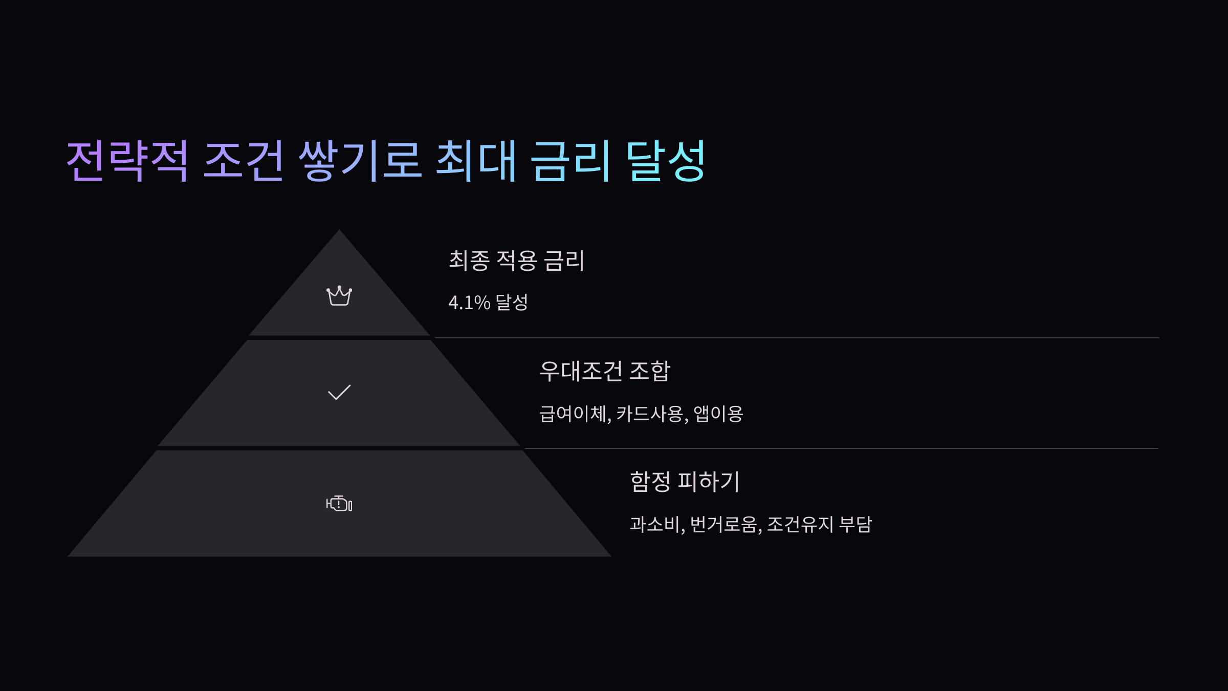 위 표처럼, 본인의 상황(직업, 소비 패턴, 디지털 기기 활용 능력 등)에 맞춰 달성 가능한 조건들을 현실적으로 판단하고, 그 합산 금리가 가장 높은 상품을 선택하는 것이 중요합니다. 무리하게 모든 조건을 충족시키려 하기보다는, 쉽게 달성 가능한 조건들을 최대한 활용하는 것이 현명합니다.