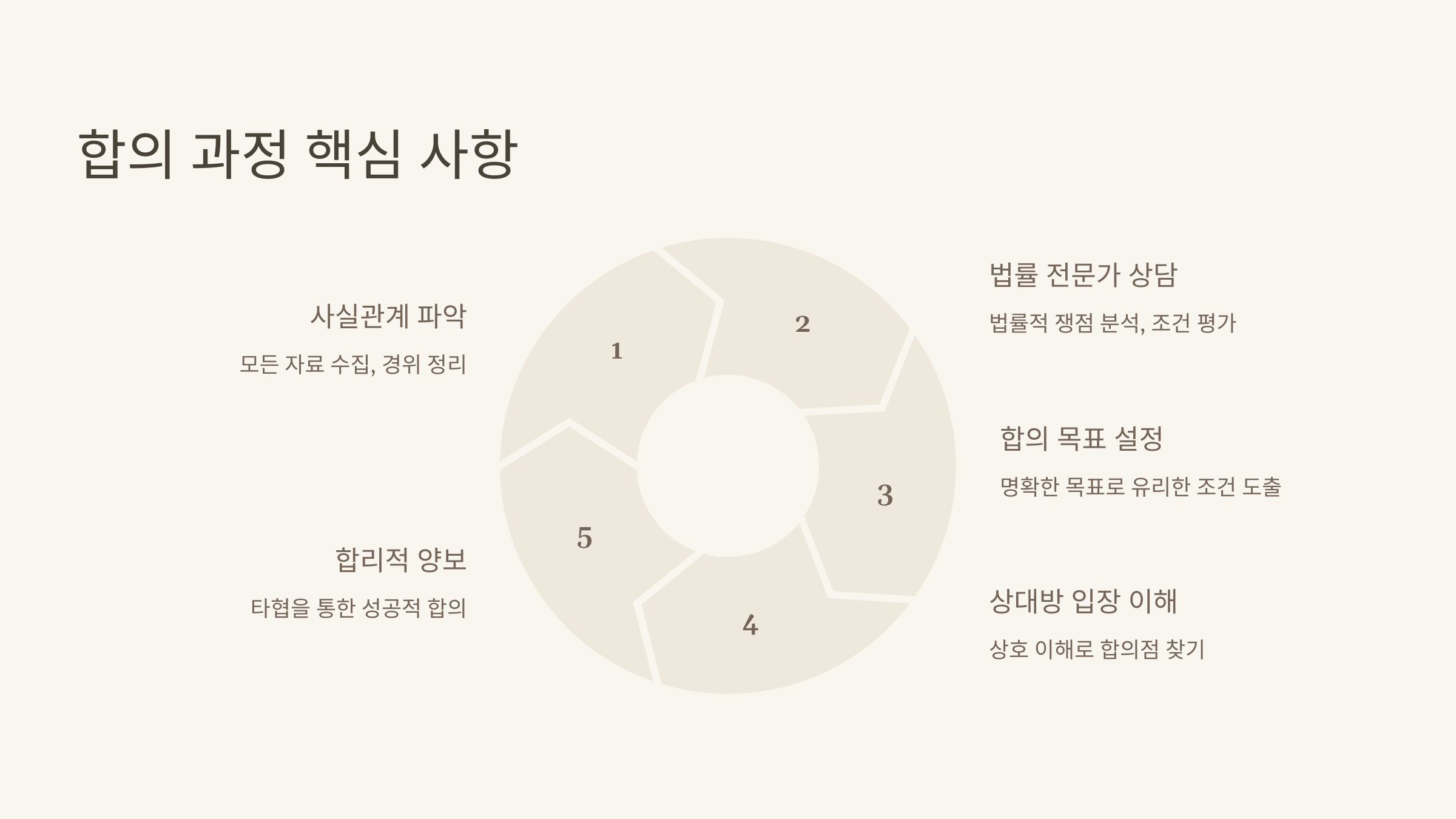 - 정확한 사실관계 파악: 합의의 전제 조건은 정확한 사실관계 파악입니다. 관련된 모든 자료를 수집하고, 사건의 경위를 꼼꼼하게 정리해야 합니다.