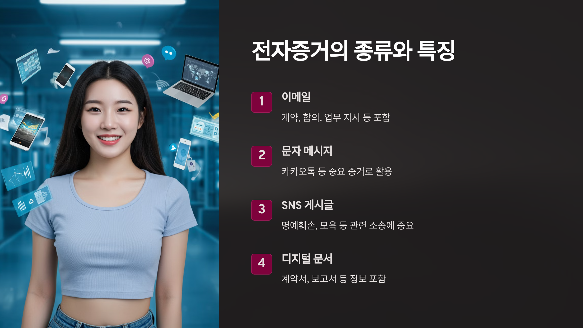 전자증거는 다양한 형태로 존재하며, 각각 고유한 특징을 가지고 있습니다. 전자증거의 종류와 특징을 이해하는 것은 효과적인 증거 수집 및 활용의 첫걸음입니다. 다음은 주요 전자증거의 종류와 특징입니다.