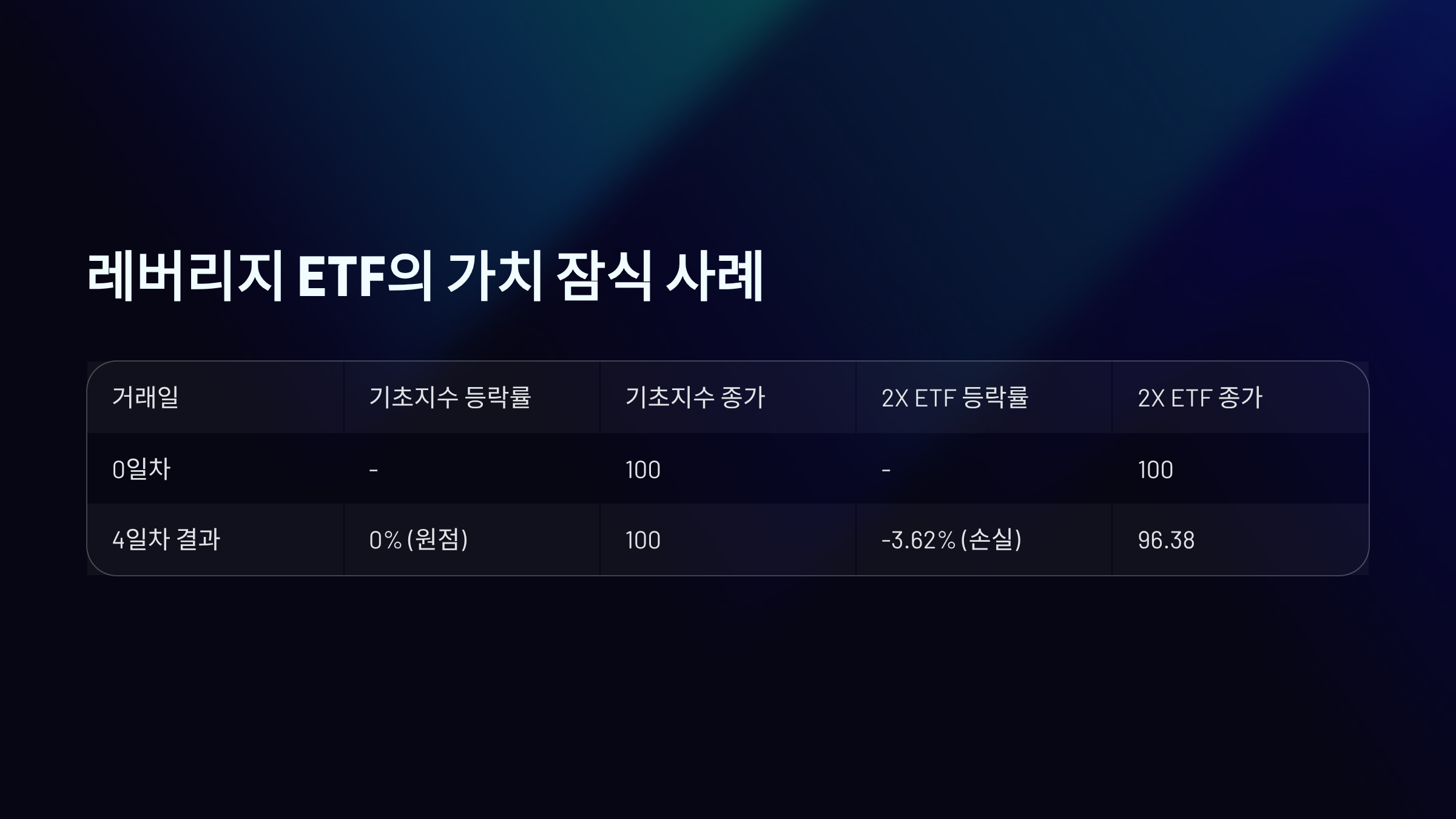 기초지수가 상승과 하락을 반복하는 횡보장에서는 이 문제가 더욱 두드러집니다. 아래 표는 기초지수가 100에서 시작하여 +10%, -10%를 반복하며 등락할 때, 2배 레버리지 ETF의 가치가 어떻게 변하는지를 보여줍니다.