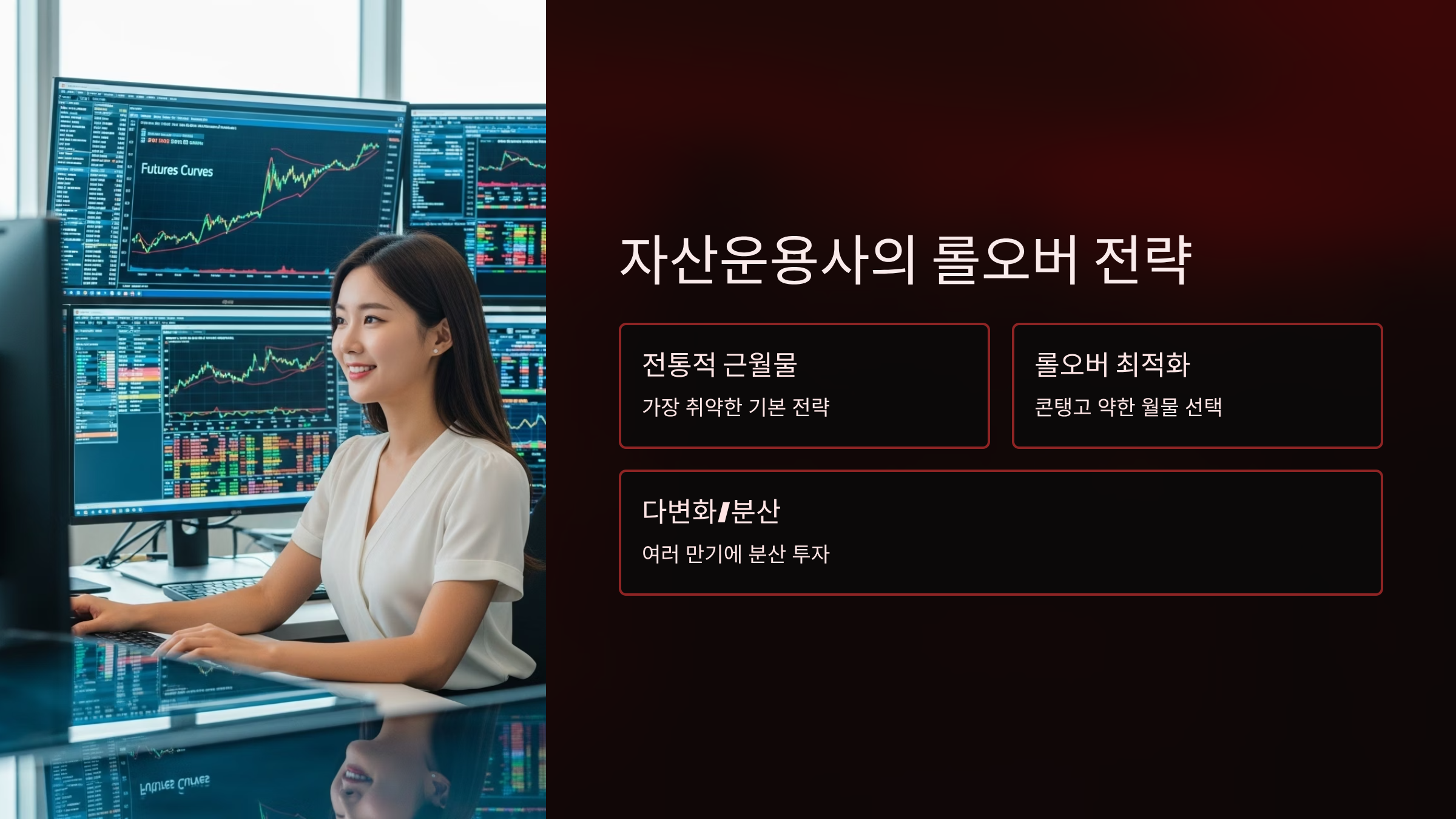 | 백워데이션 시장 탐색 | 선물 커브가 백워데이션 상태인 자산을 찾아 플러스(+) 롤 일드를 추구 | 공급 부족, 지정학적 리스크 등으로 특정 월물의 가격이 급등하는 시장 | 백워데이션은 영구적이지 않으며, 콘탱고로 전환될 리스크가 항상 존재함. |