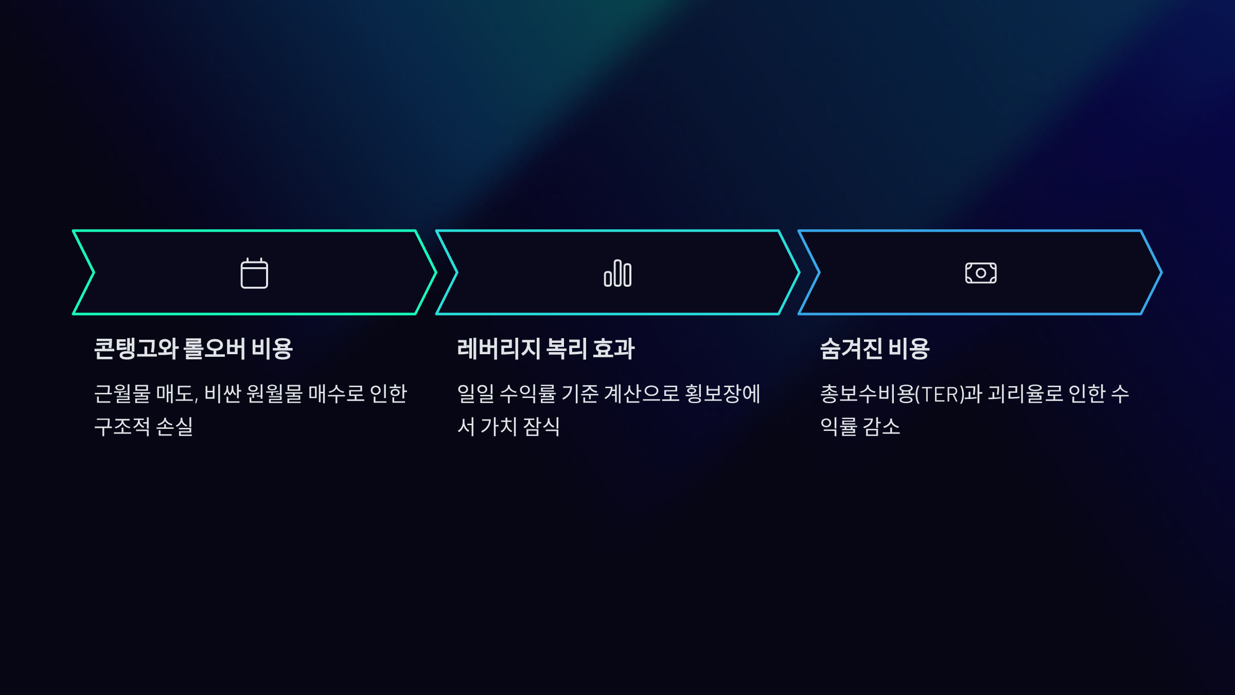기초지수의 수익률을 2배, 3배로 추종하는 레버리지 상품이나, 반대로 움직이는 인버스 상품에 투자하여 시장 상승기뿐만 아니라 하락기에도 수익을 추구하거나 위험을 회피하는 등 다채로운 전략을 구사할 수 있습니다. - 단점 1: 롤오버 비용 (Contango & Backwardation)