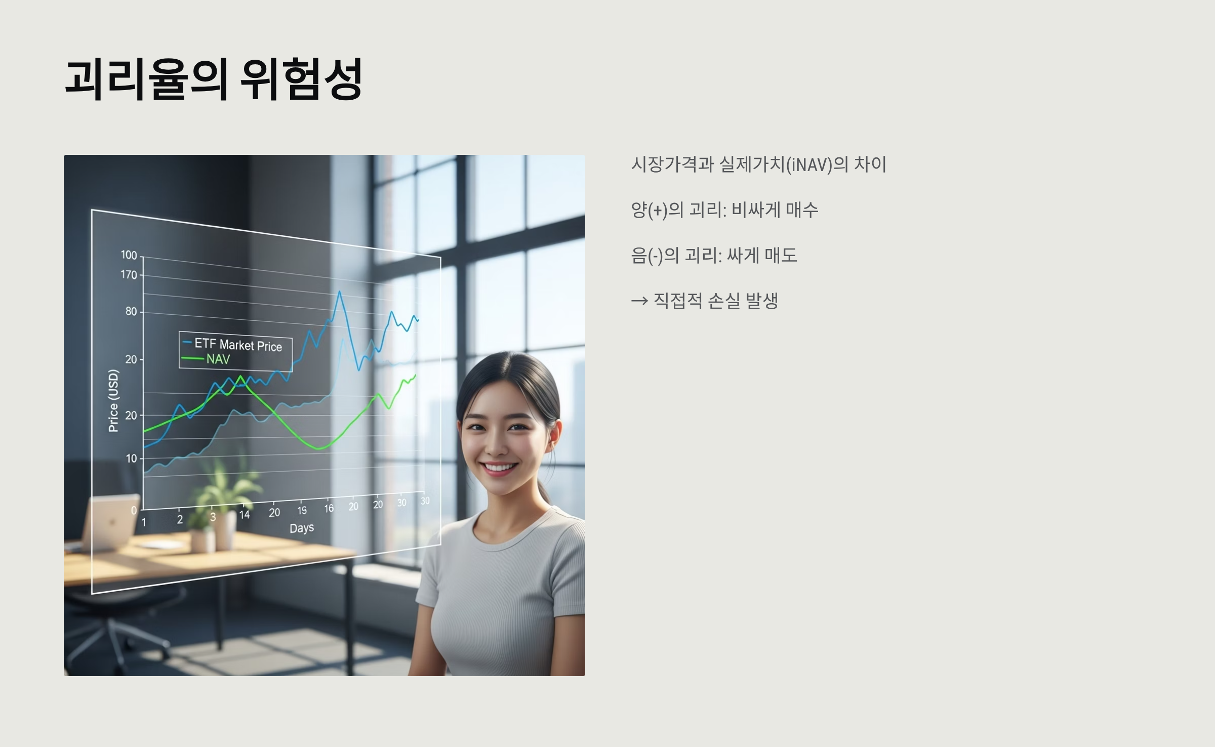 괴리율이란 ETF의 시장 가격과 실제 순자산가치(iNAV) 사이의 차이를 말합니다. 롤오버 비용, 운용 보수, 그리고 시장의 수급 불균형 등으로 인해 ETF 가격이 기초자산의 가치를 정확히 따라가지 못하는 괴리율이 발생할 수 있습니다. 특히 해외 자산을 기초로 하는 선물 ETF의 경우, 국내 시장과 해외 시장의 거래 시간 차이로 인해 괴리율이 더 크게 나타날 수 있습니다. - 단점 3: 장기투자의 불리함 (특히 레버리지/인버스)
