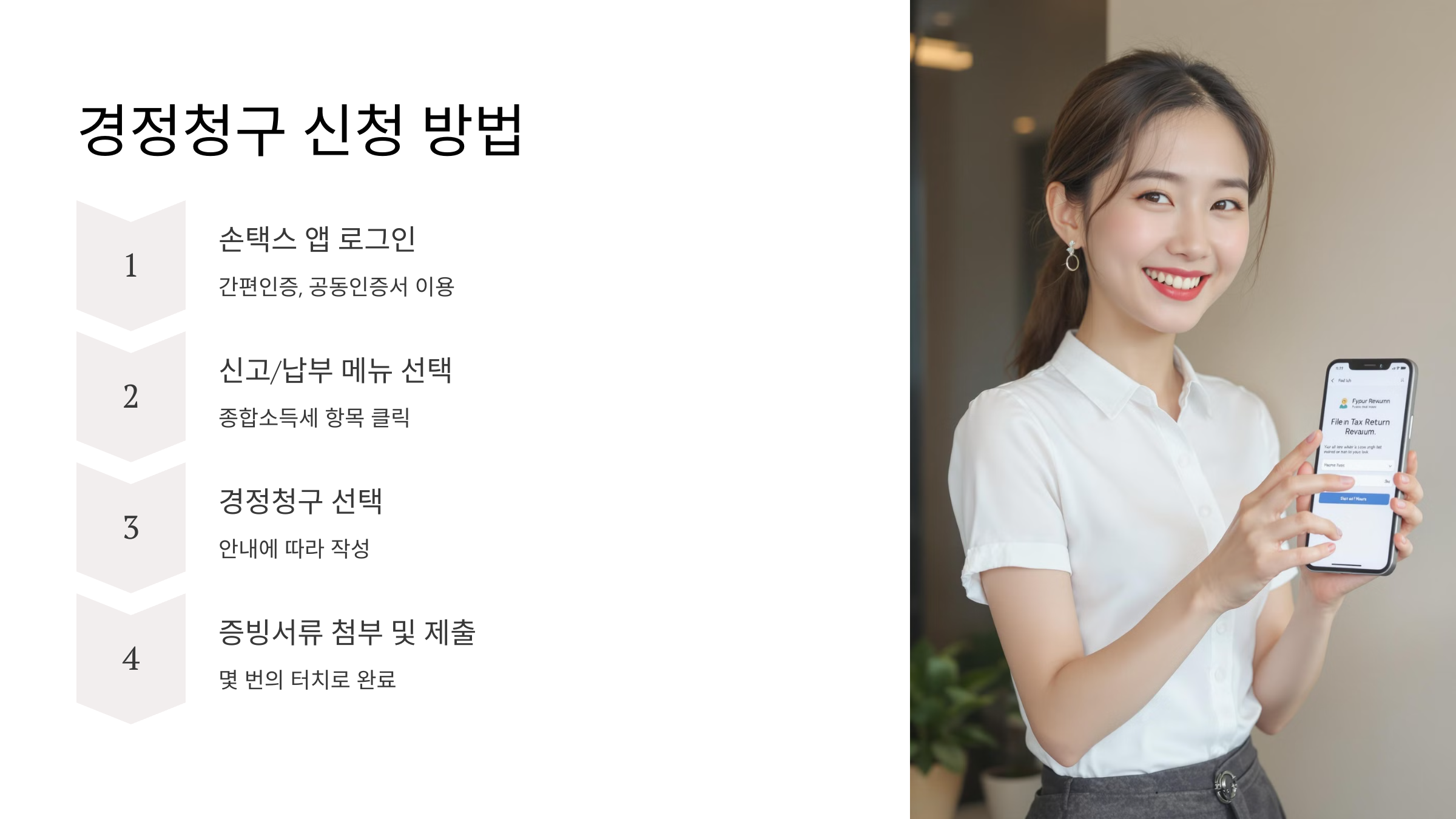 - 경정청구 간편 신청: 세금을 과다하게 납부한 경우, 손택스를 통해 간편하게 경정청구를 신청하여 환급받을 수 있습니다.