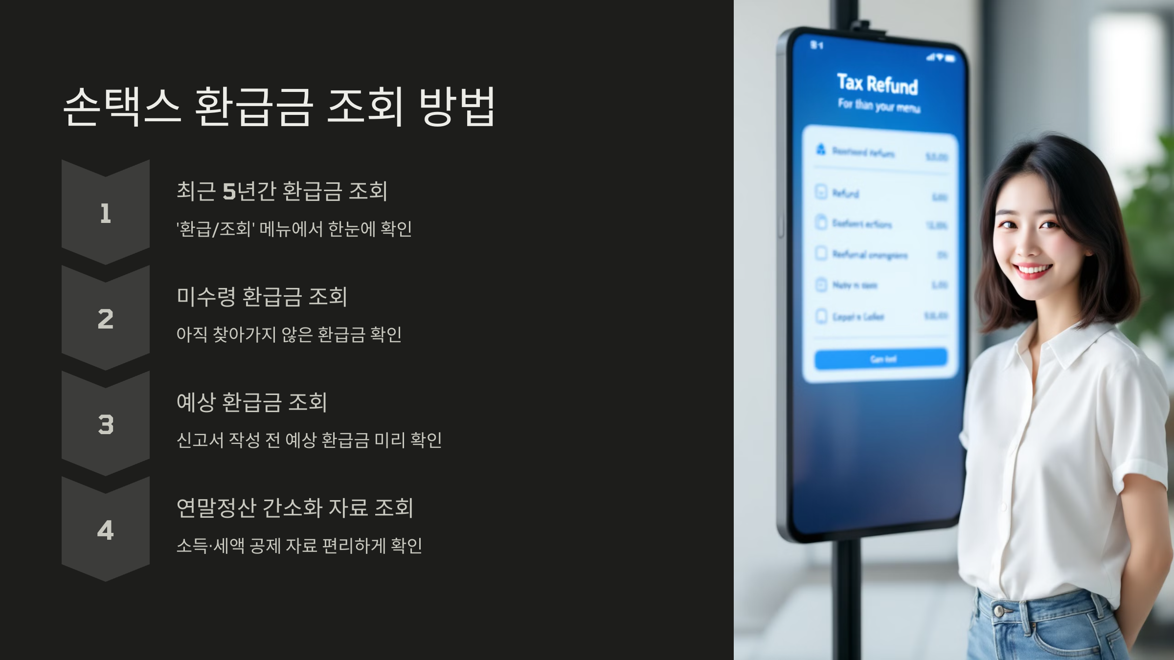 손택스는 다양한 방식으로 환급금을 조회할 수 있는 기능을 제공하여, 사용자 편의성을 극대화했습니다. 다음은 손택스에서 환급금을 조회하는 대표적인 방법들입니다.