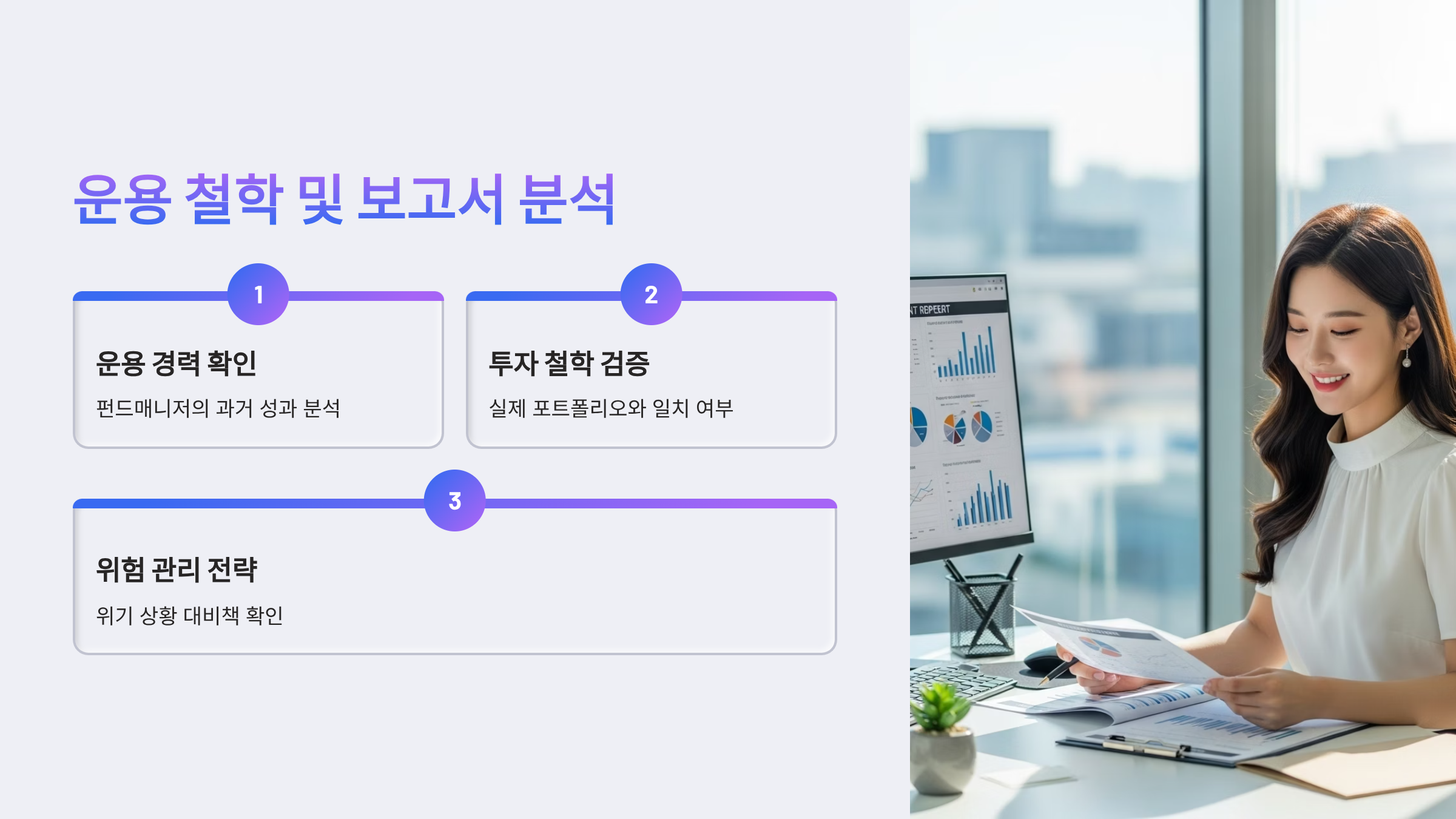 단순히 어떤 테마에 투자하는지를 넘어, 해당 펀드매니저가 어떤 경제 상황에서 강점을 보이고, 어떤 리스크 관리 원칙을 가지고 있는지 파악해야 합니다. 이는 마치 기업에 투자하기 전 CEO의 경영 철학과 비전을 살펴보는 것과 같습니다. 다음은 보고서 분석 시 반드시 확인해야 할 핵심 사항들입니다.