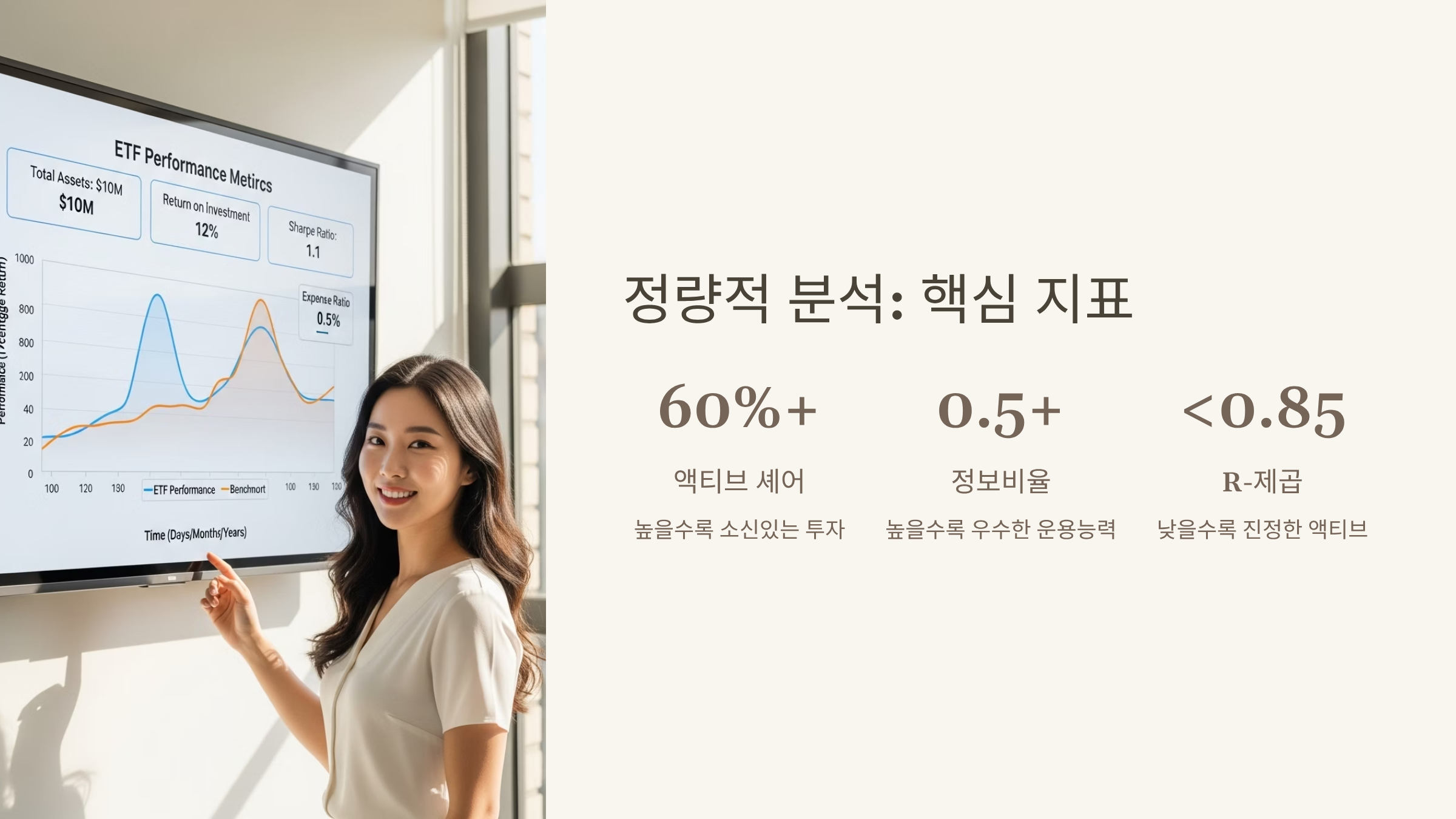| 횡보장/박스권 | 방향성 부재, 지수 변동성 낮고, 개별 종목 장세 심화 | 커버드콜, 배당 등 안정적인 인컴 창출형 또는 특정 테마 집중형 액티브 ETF가 유리 | 펀드매니저의 종목선택(Stock-picking) 능력이 성과를 좌우하는 핵심 시기 |