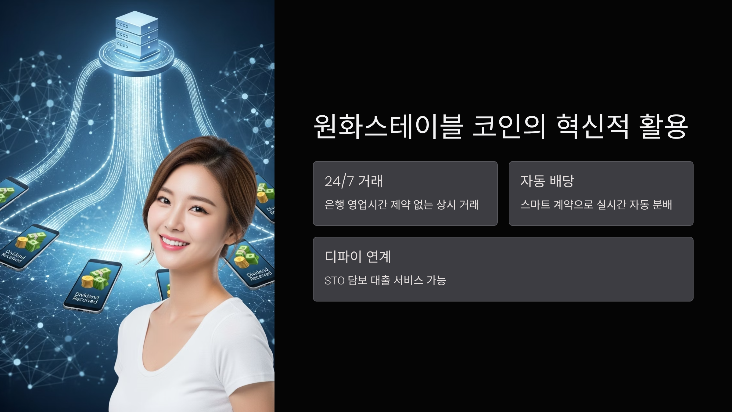하지만 원화스테이블 코인을 활용하면 이 모든 과정이 스마트 계약으로 자동화됩니다. 자산운용사가 배당금 총액을 원화스테이블 코인으로 스마트 계약 주소에 예치하면, 계약은 실시간으로 토큰증권 보유자 목록과 지분율을 파악하여 각자의 디지털 지갑으로 정확한 배당금을 자동으로 분배합니다. 이는 관리 비용을 절감하고, 배당 지급의 투명성과 정확성을 높이며, 투자자에게는 새로운 경험을 제공합니다. 이러한 원화스테이블 코인 기반 시스템은 우리나라 STO 시장의 경쟁력을 한층 더 높일 것입니다.