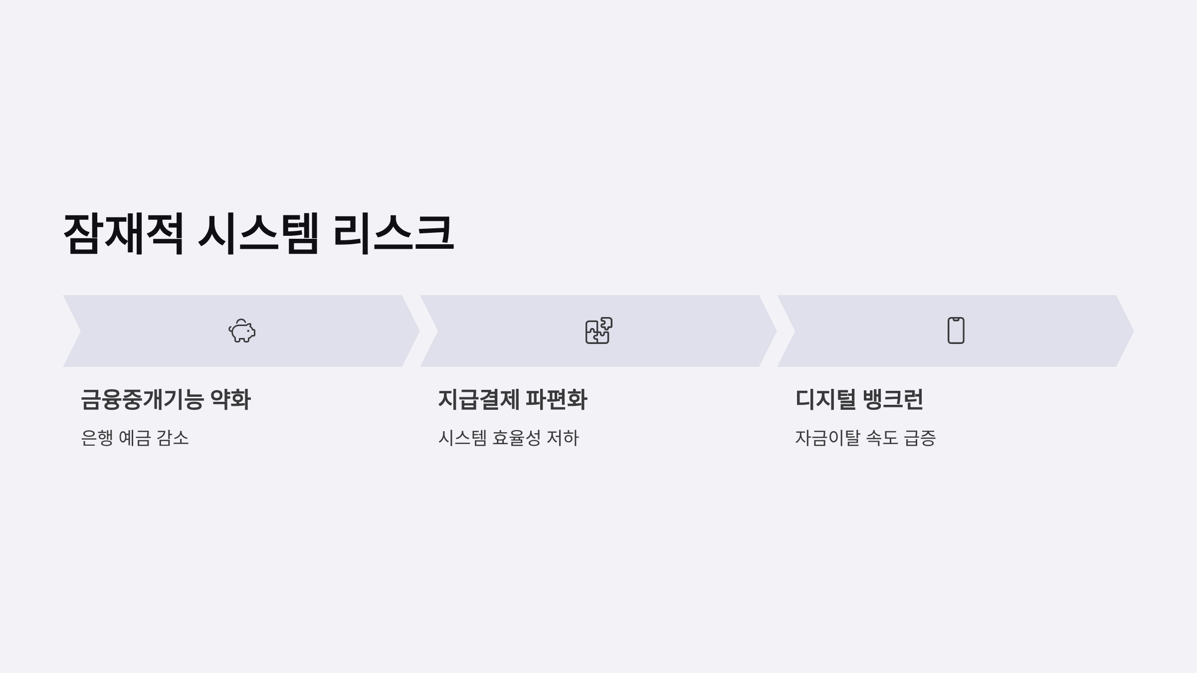 단순히 민간 스테이블코인의 시장 점유율이 줄어드는 것을 넘어, CBDC와 '원화 스테이블코인'의 어설픈 공존은 우리나라 금융 시스템 전체에 예기치 못한 리스크를 초래할 수 있습니다. 전문가들은 다음과 같은 시스템 리스크를 경고합니다.