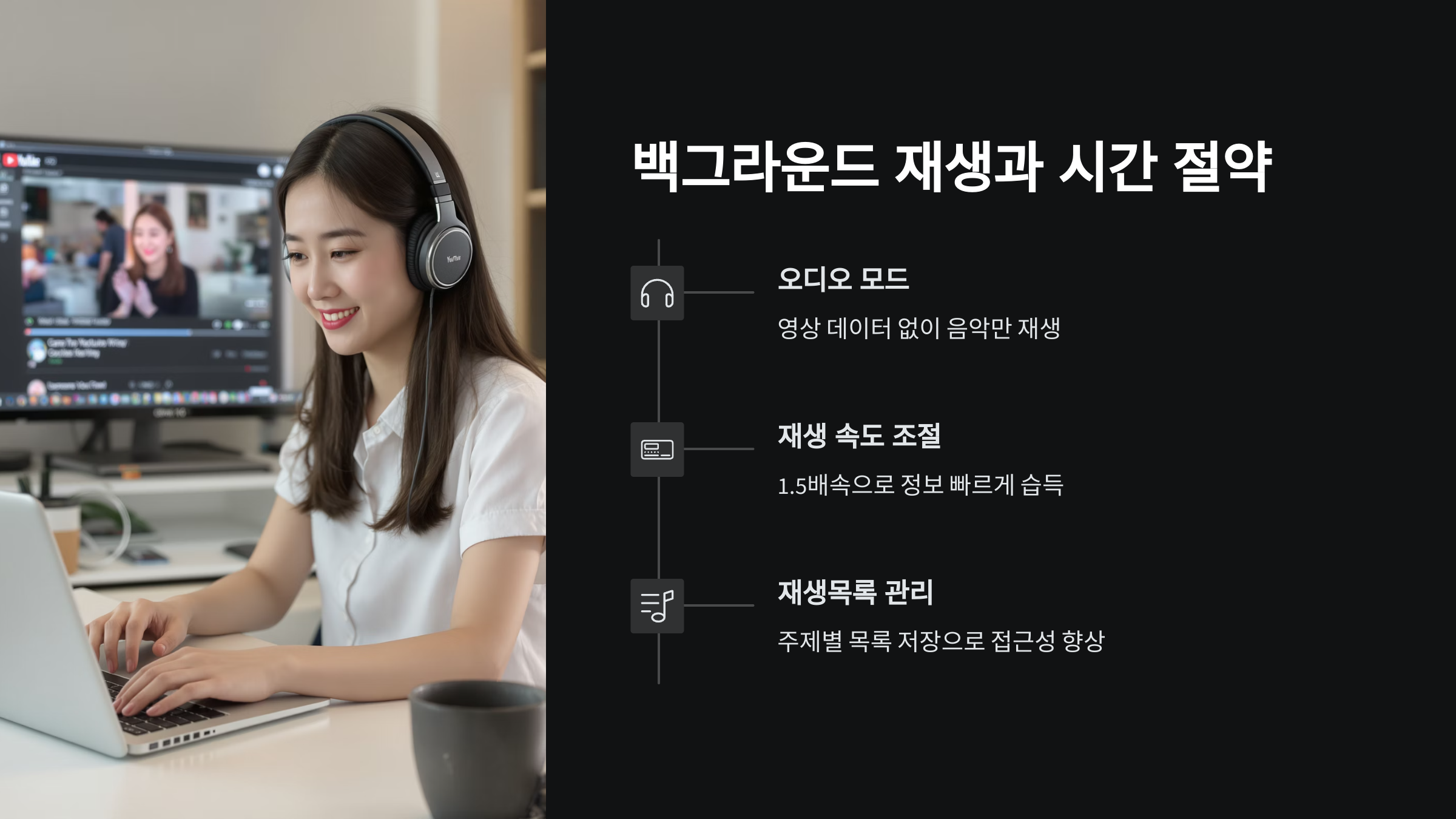 이러한 기능들은 별도의 `유튜브 음원추출` 없이도 오디오 중심의 콘텐츠 소비를 매우 효율적이고 경제적으로 만들어 줍니다.