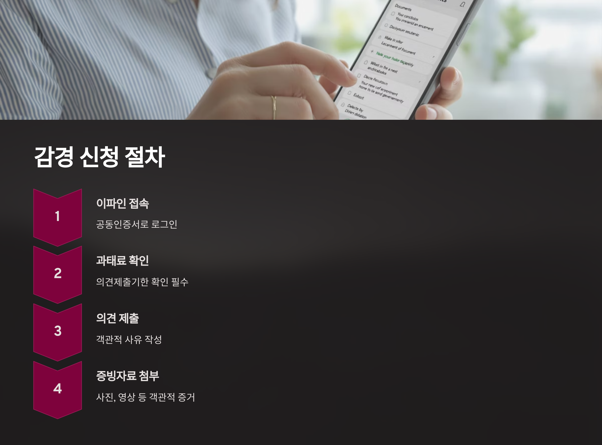 | 2단계: 감경/면제 사유 검토 및 의견 제출 | 법적 근거 및 객관적 증빙 기반의 적극적 소명 | 이파인을 통한 '의견진술' 신청, 감경/면제 사유 구체적 작성, 증빙자료(사진, 영상, 확인서 등) 첨부 | 최대 과태료 전액 면제 또는 추가 감경 (50% 등) 가능성 |