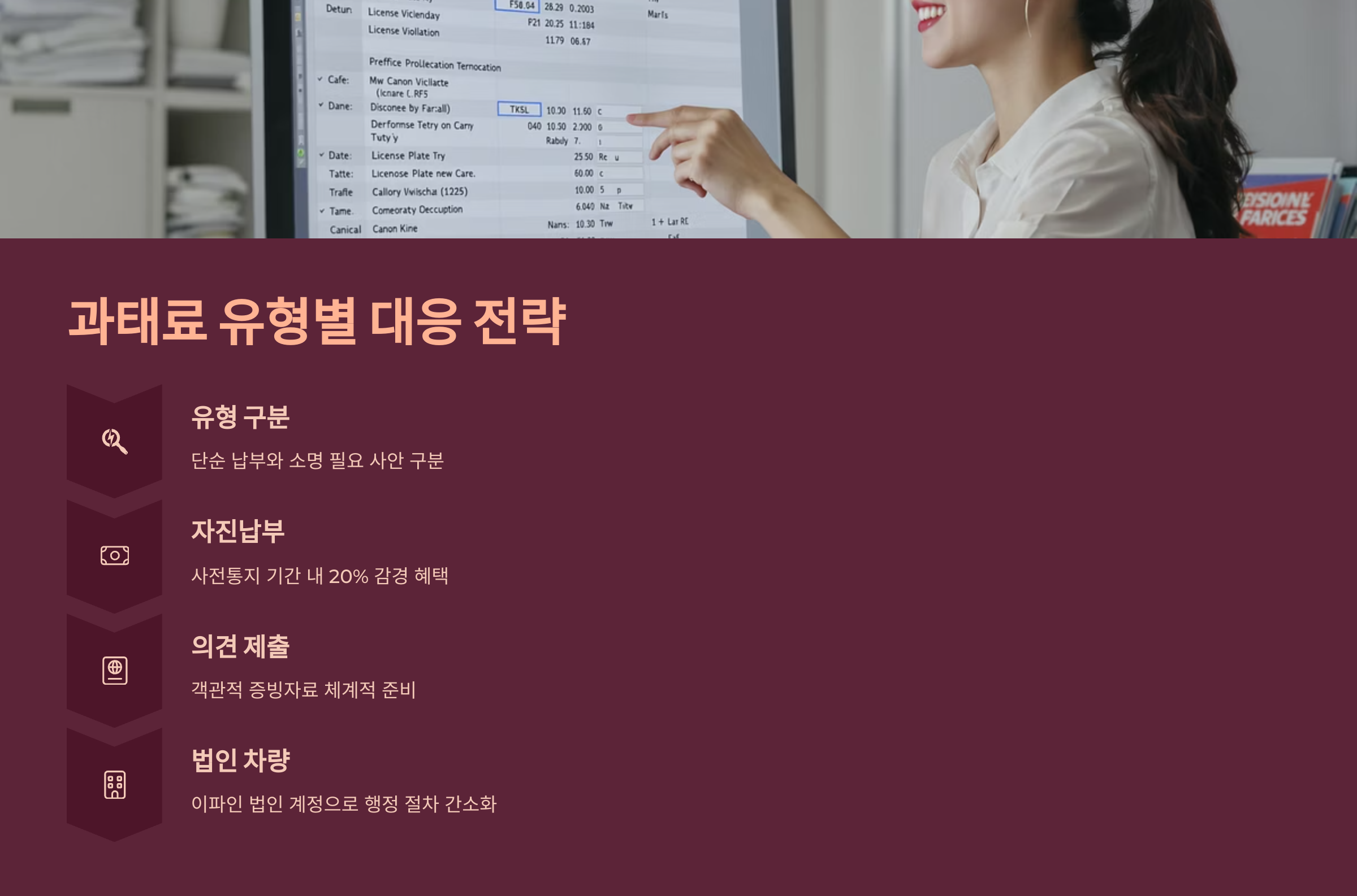 | 1단계: 과태료 발생 인지 및 초기 대응 | 신속한 사실 확인 및 자진납부 감경 활용 | 이파인 '최근단속내역' 또는 '미납과태료' 조회, 사전통지서 확인, 의견제출기한 내 자진납부 (20% 감경) | 가장 확실하고 빠른 지출 최소화 (과태료의 20% 절감) |