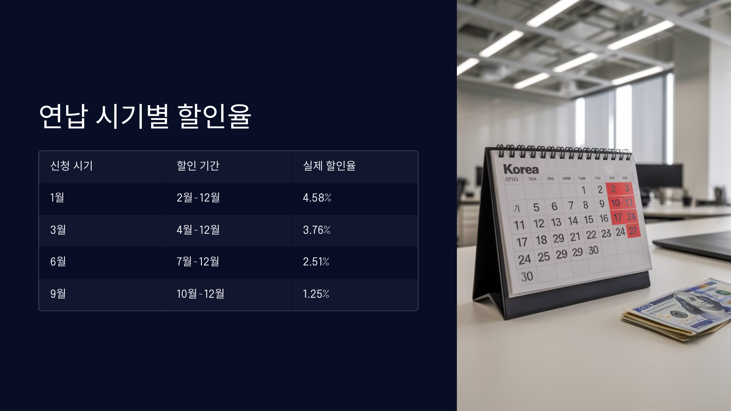 | 9월 연납 | 9월 16일~31일 | 0.75% | 연말정산 대비 | 최소 할인율 |