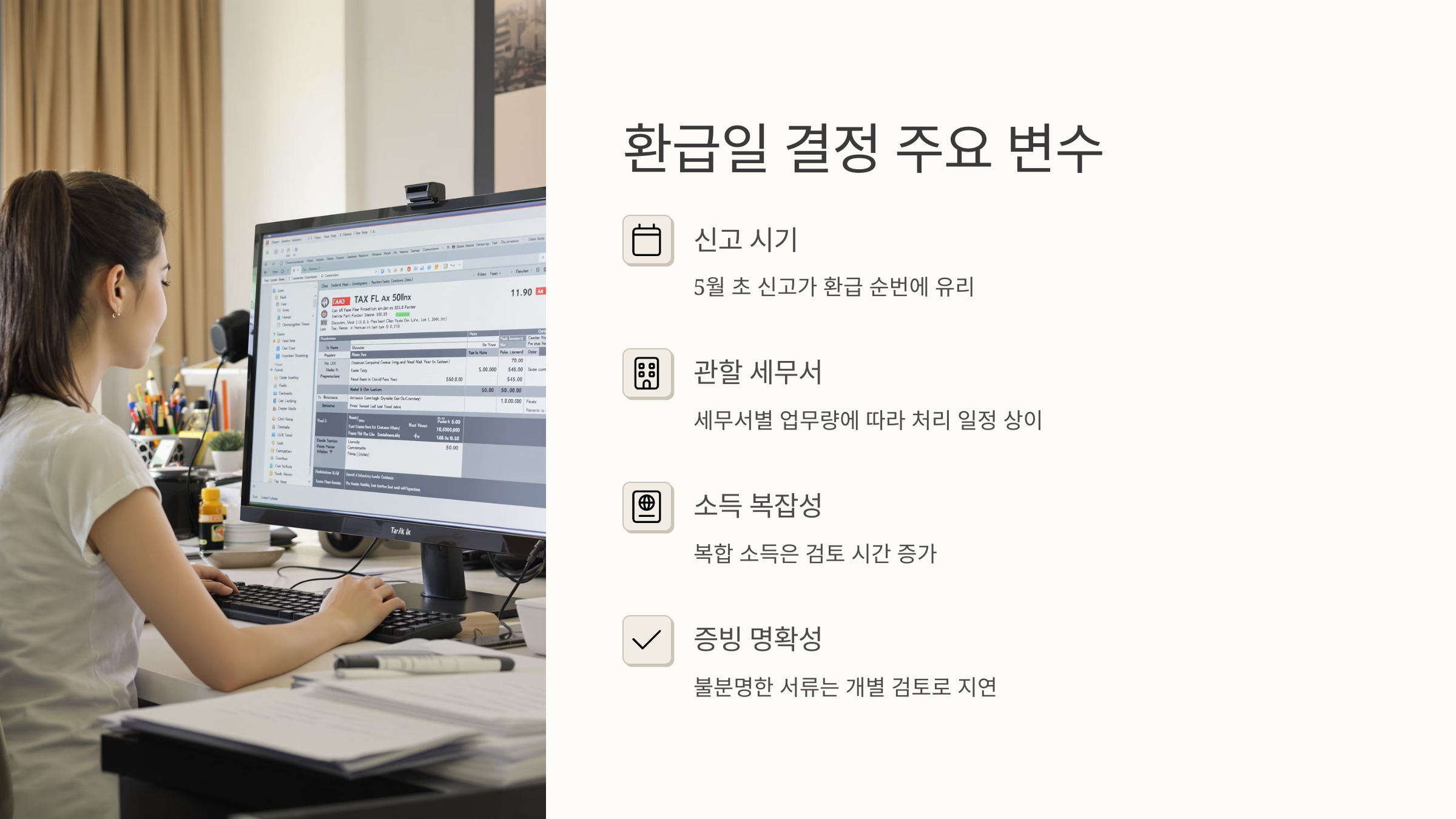 가장 중요한 변수는 국세청의 '일괄처리' 시스템과 '개별 검토' 대상 여부입니다. 5월 초에 신고를 마치는 것이 환급 순번에서 유리한 고지를 점하는 가장 기본적인 방법입니다. 신고가 접수되는 순서대로 처리되므로, 마감일에 임박해서 신고할수록 후순위로 밀려나게 됩니다. 다음은 실제 환급일에 영향을 미치는 구체적인 변수들입니다.