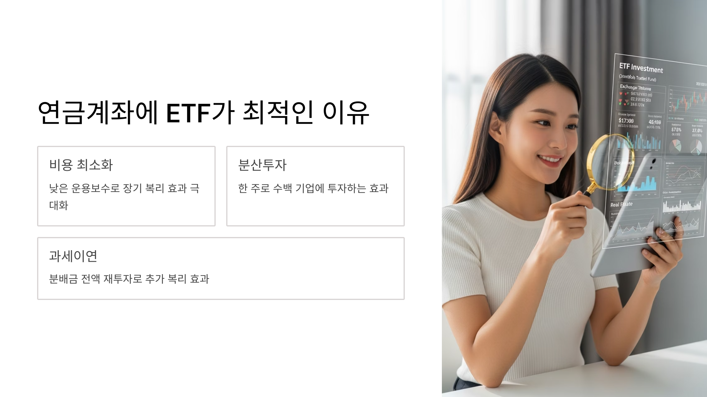 연금계좌는 장기적인 관점에서 노후 자산을 불려나가는 인내의 그릇과 같습니다. 이러한 연금계좌의 목적과 주식 ETF의 본질적인 특성은 완벽한 시너지를 발휘합니다. 많은 금융상품 중에서도 유독 주식 ETF란 상품이 연금 투자에 가장 적합한 도구로 꼽히는 이유는 명확합니다.