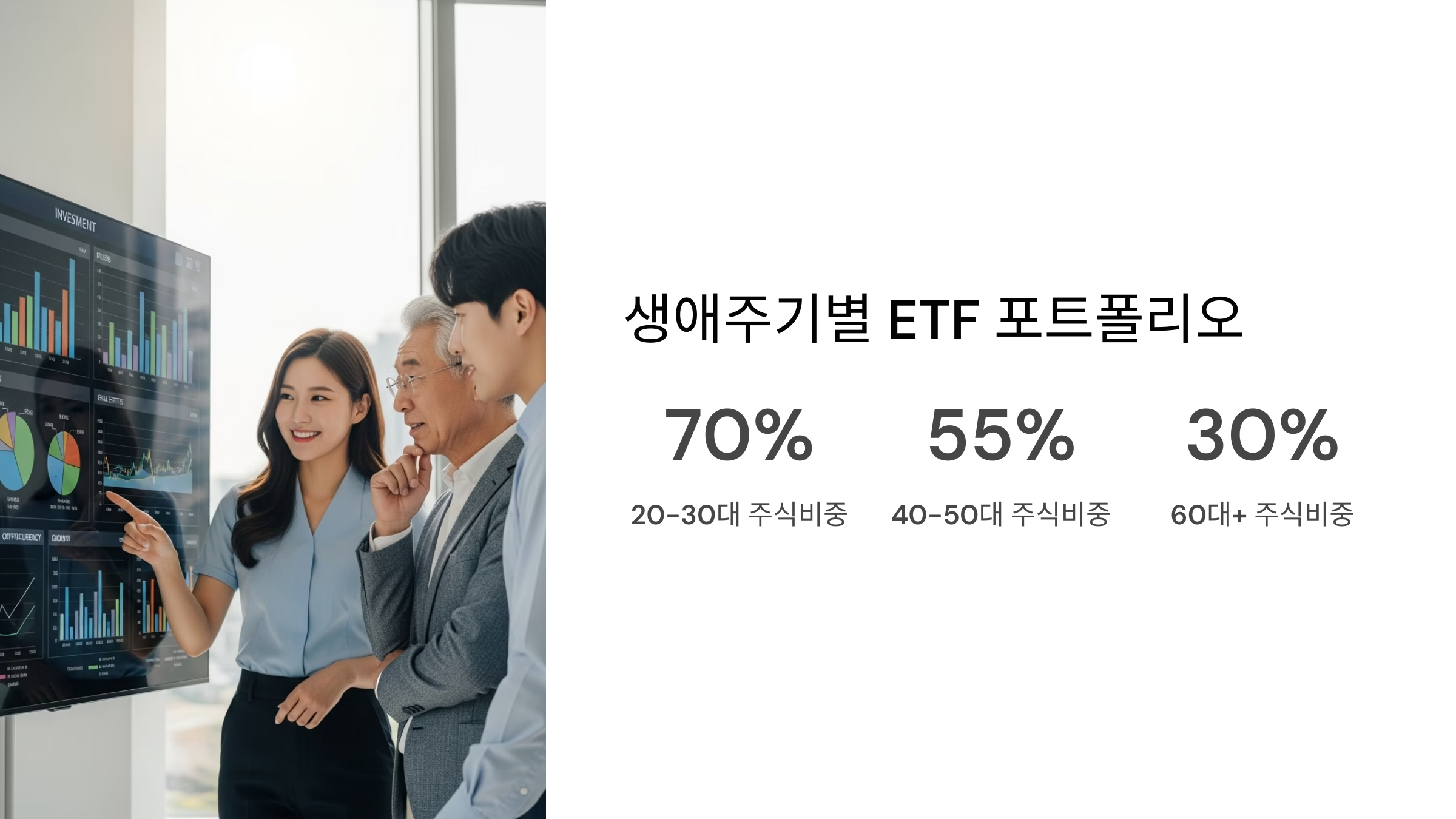 일반적으로 사회초년생처럼 투자 기간이 많이 남은 20~30대는 높은 기대수익률을 위해 주식과 같은 위험자산의 비중을 높게 가져가는 공격적인 포트폴리오를, 은퇴가 가까워지는 40~50대는 자산 성장을 추구하면서도 안정성을 보강하는 중립적인 포트폴리오를, 은퇴 후 자산을 인출해야 하는 60대 이상은 자산 보존에 초점을 맞춘 안정적인 포트폴리오를 구성하는 것이 바람직합니다. 잘 구성된 주식 ETF란 포트폴리오는 이러한 생애주기 변화에 유연하게 대응할 수 있습니다.