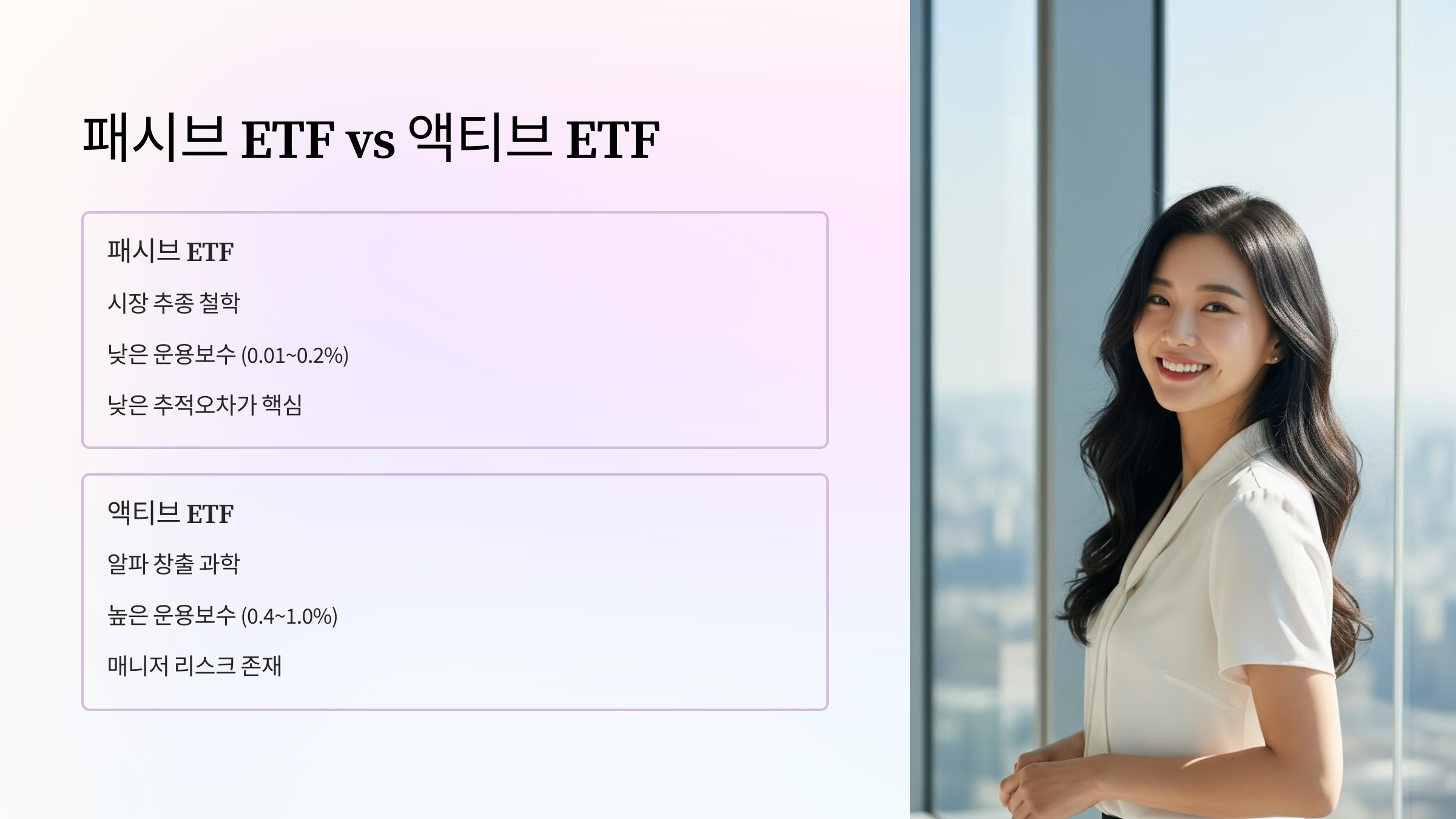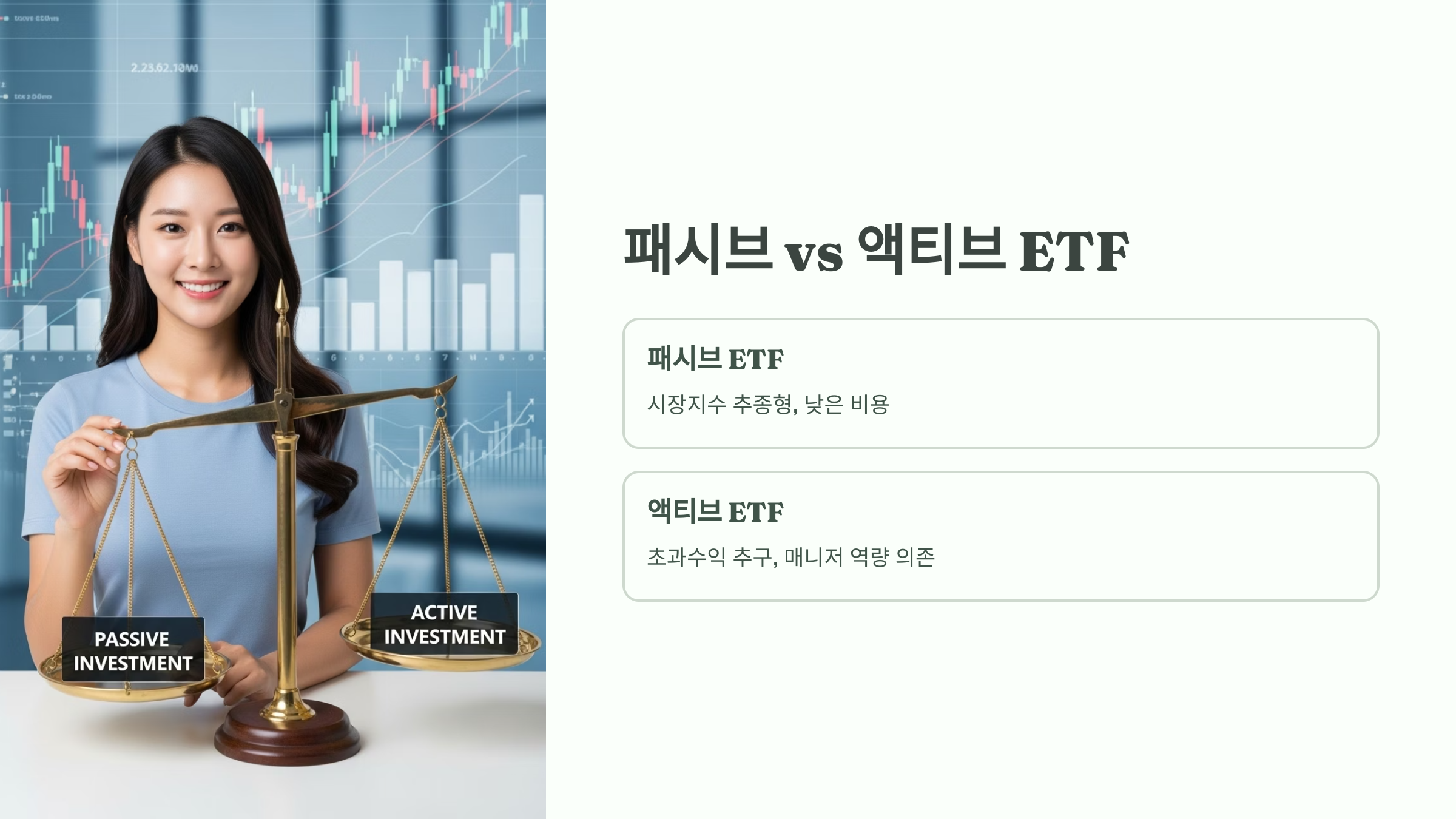 | 비교 항목 | 시장지수 추종형 (패시브) ETF | 액티브 ETF |