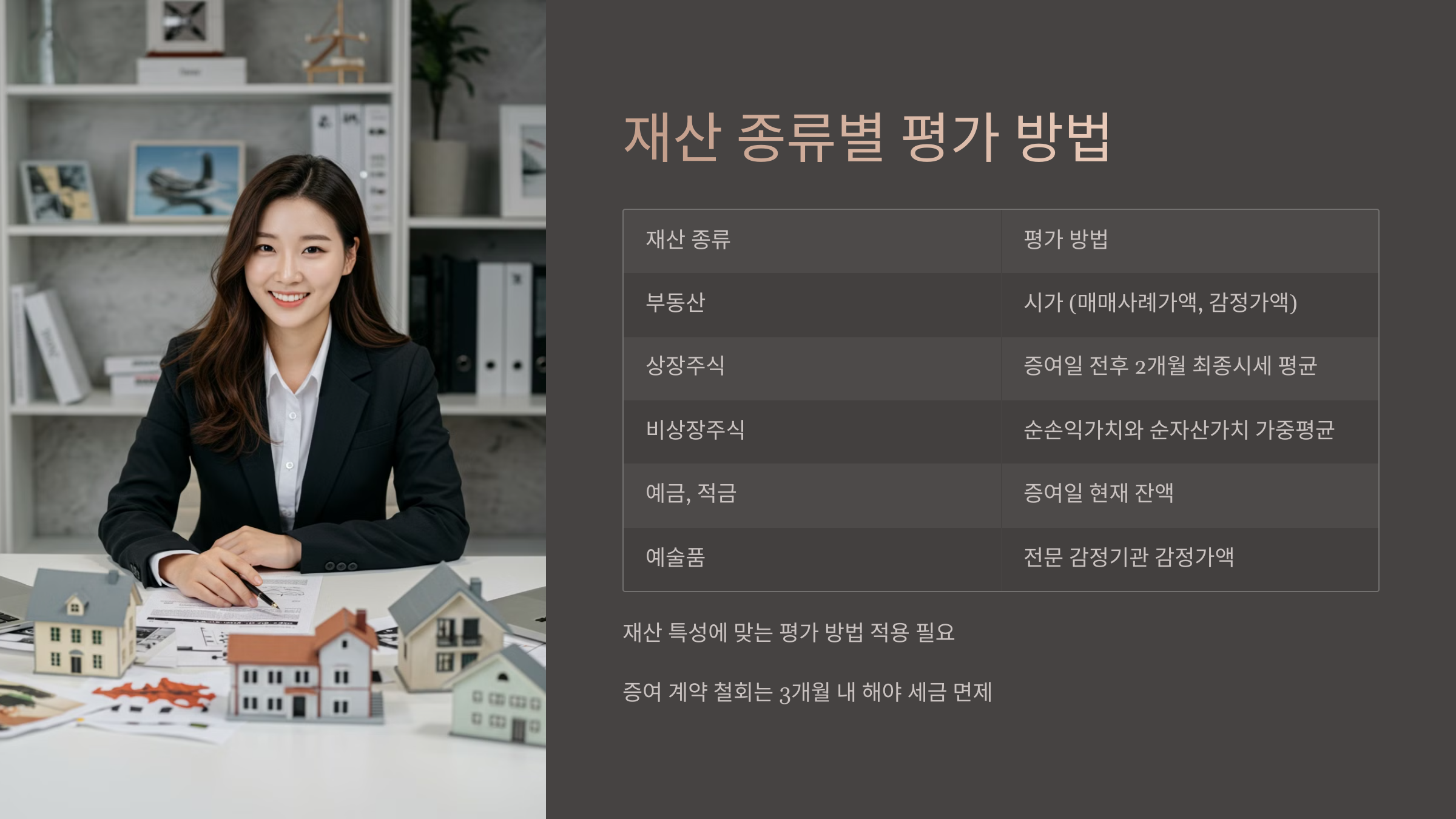 증여세는 증여받은 재산의 가치를 평가하여 과세표준을 계산합니다. 이때, 재산 종류별로 평가 방법이 다르므로, 증여할 재산의 특성에 맞는 평가 방법을 적용해야 합니다.