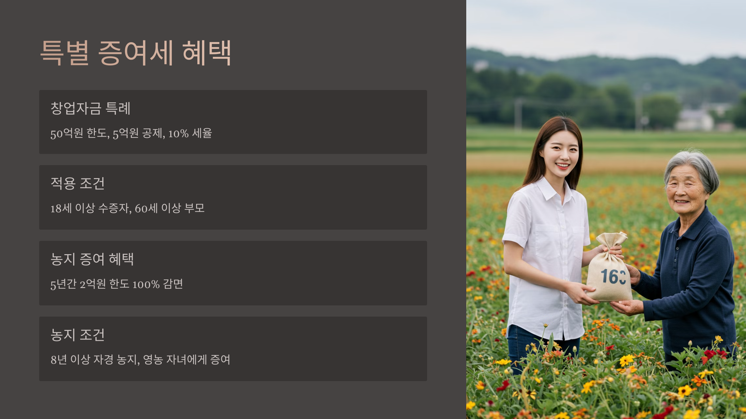 - 대상: 농업인이 영농자녀에게 농지, 초지, 산림지 등을 증여하는 경우