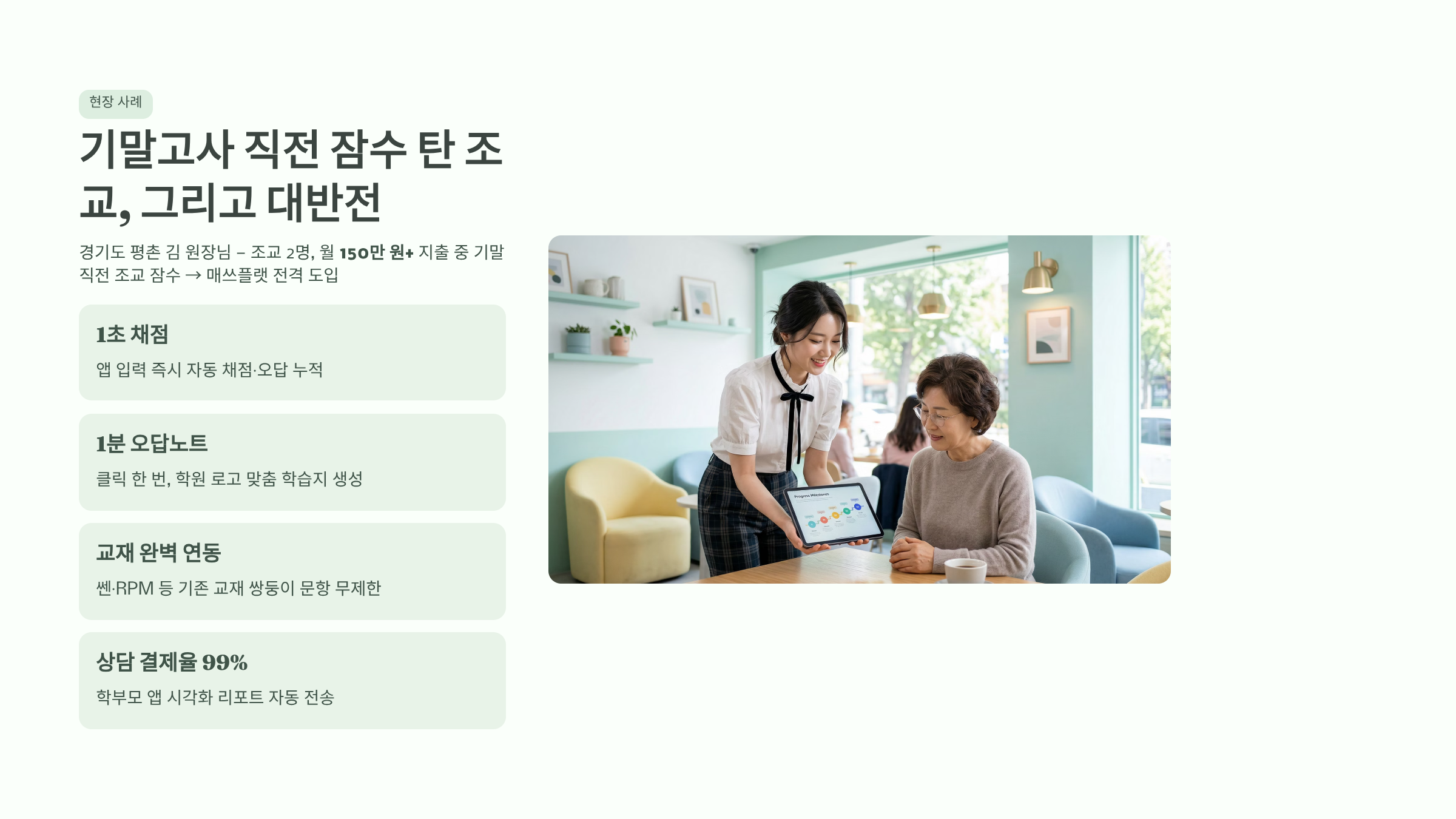 - 학부모 결제율 99%를 만드는 시각화 리포트: 매주 학부모 전용 앱으로 전송되는 빅데이터 기반의 정밀 분석표는 원장님의 전문성을 돋보이게 하며, 신규 방문 상담 시 압도적인 등록률을 기록하게 만들었습니다.